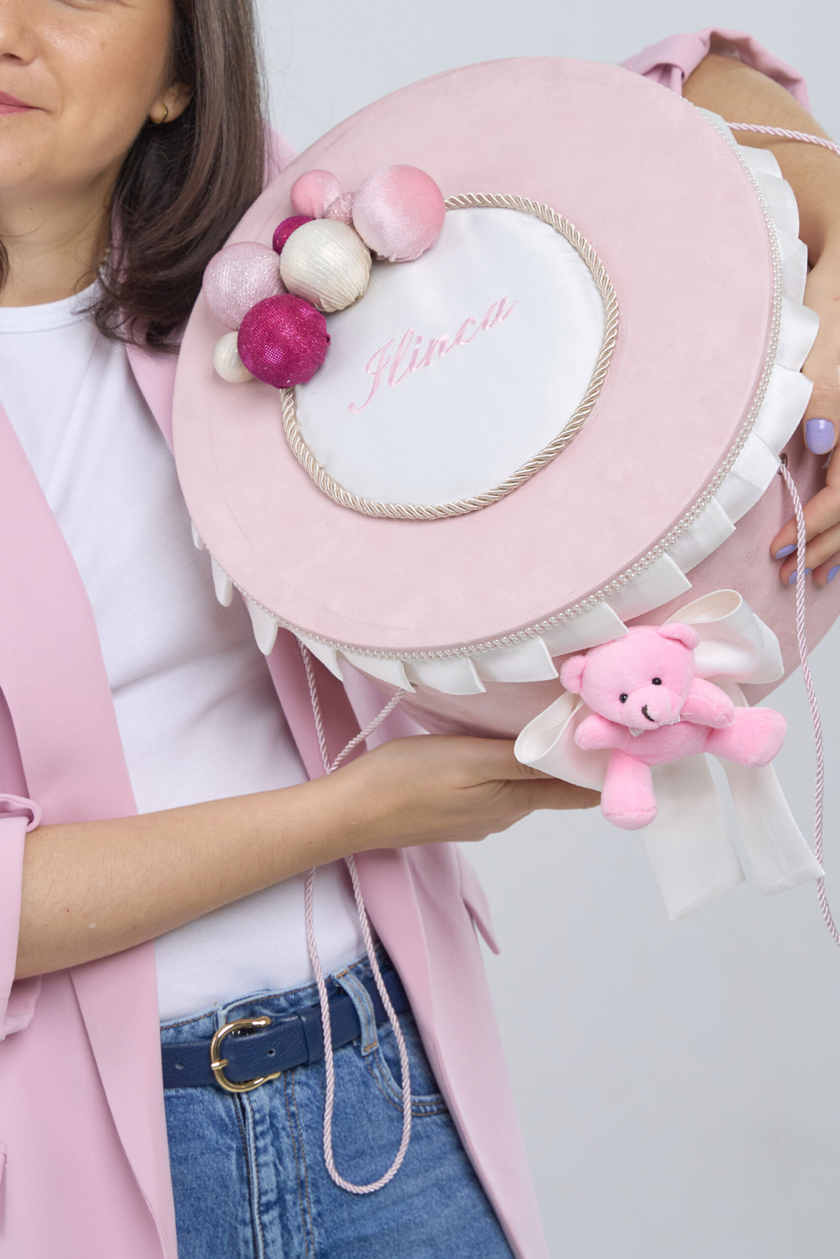 Cutie decorată cu baloane jucăușe și fundiță, perfectă pentru transportul hăinuțelor și accesoriilor de botez, elegantă și rafinată, perfectă pentru evenimente deosebite.