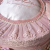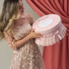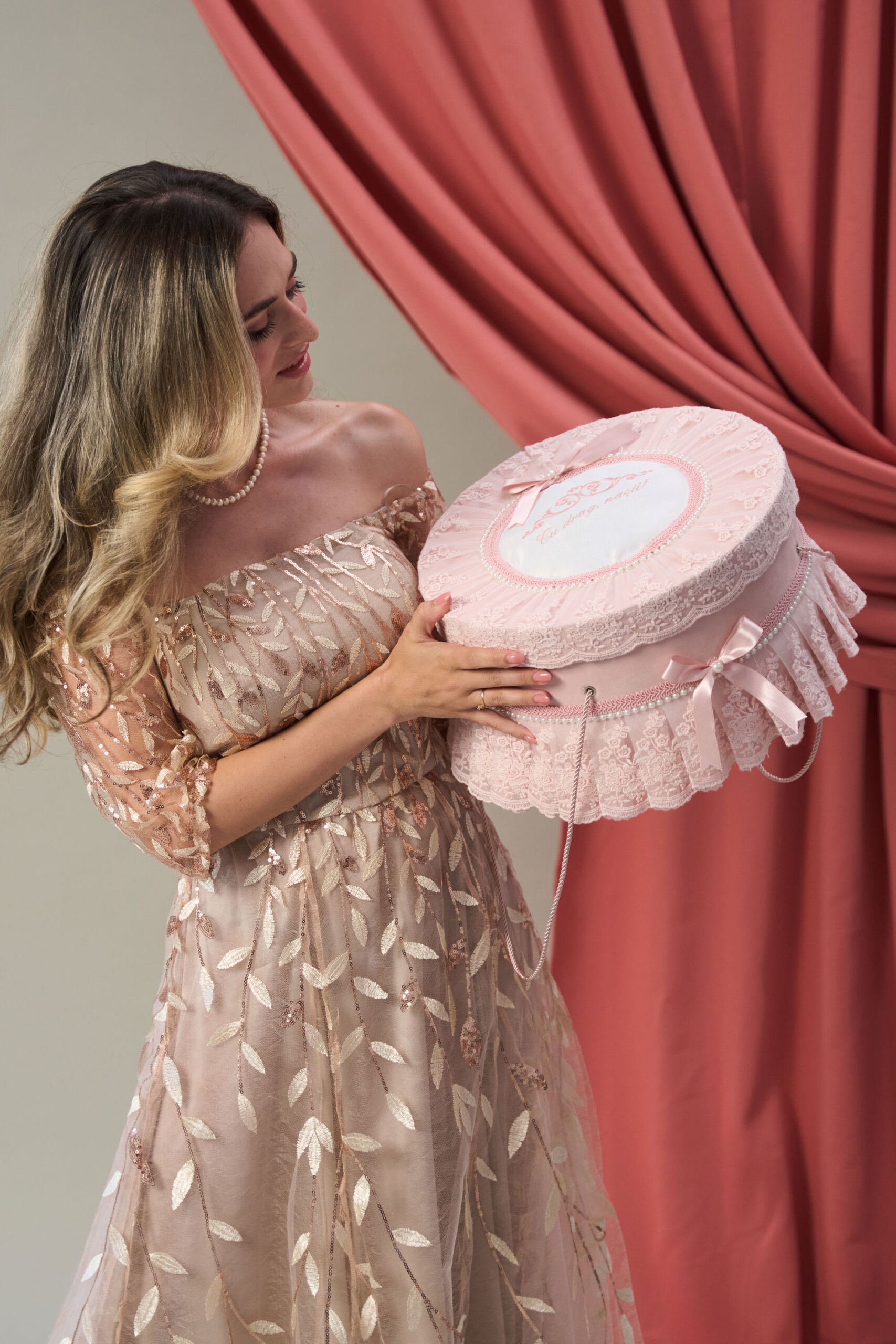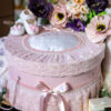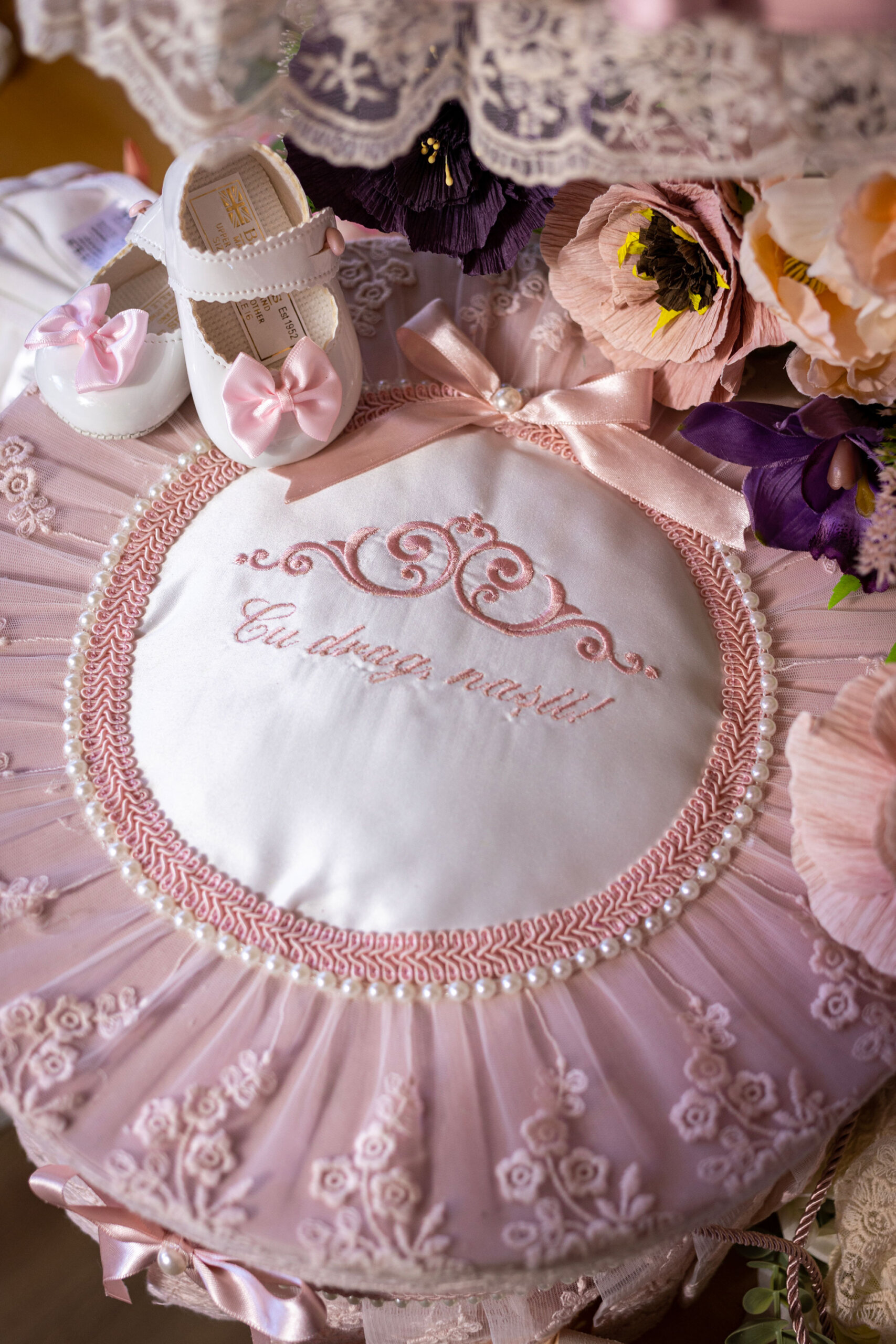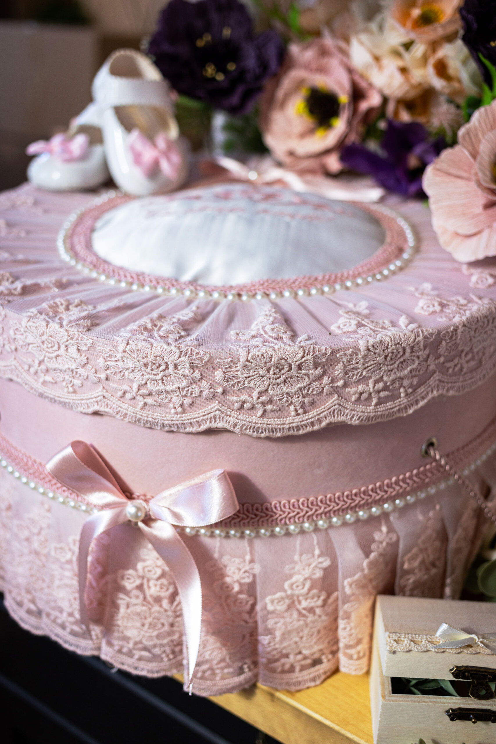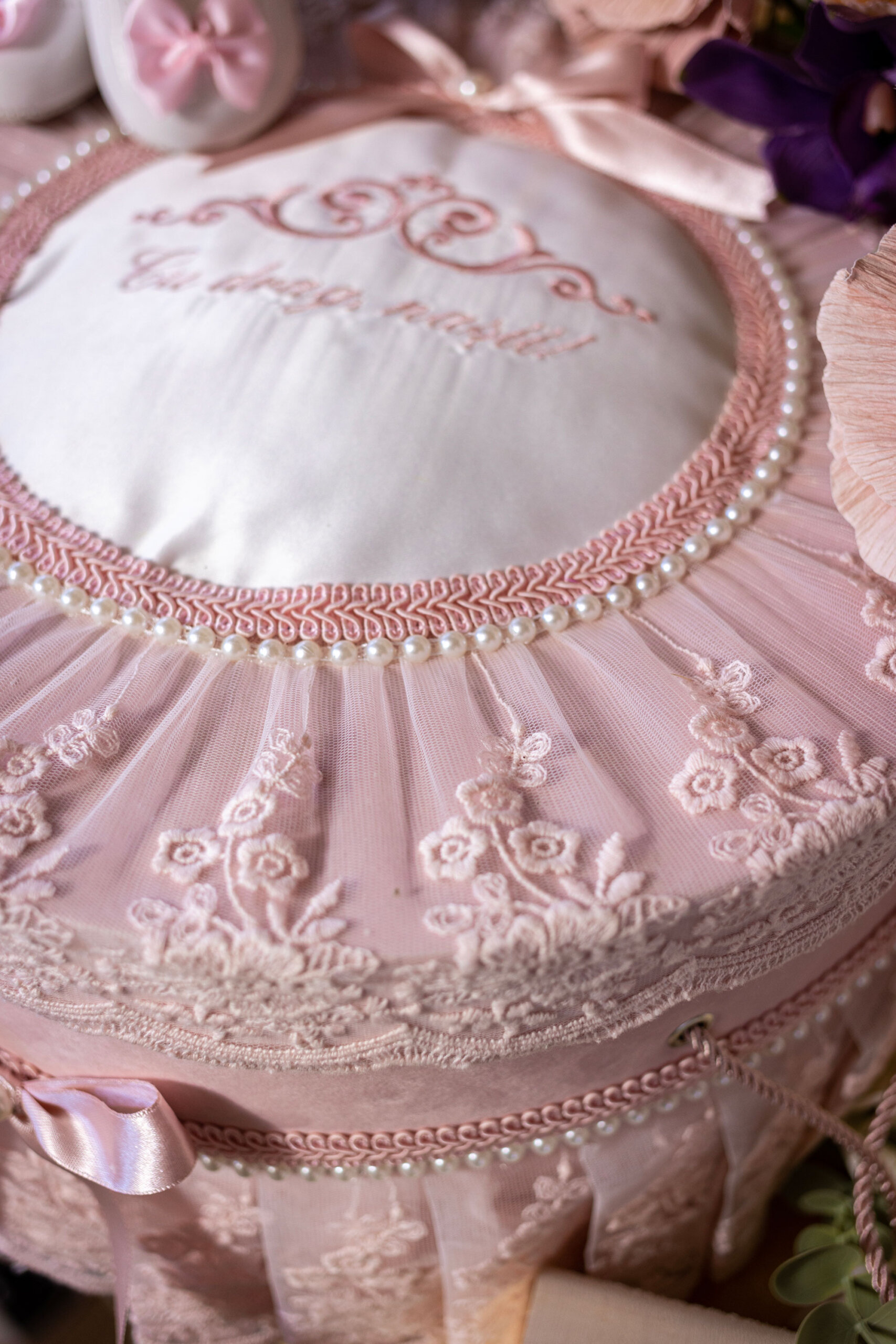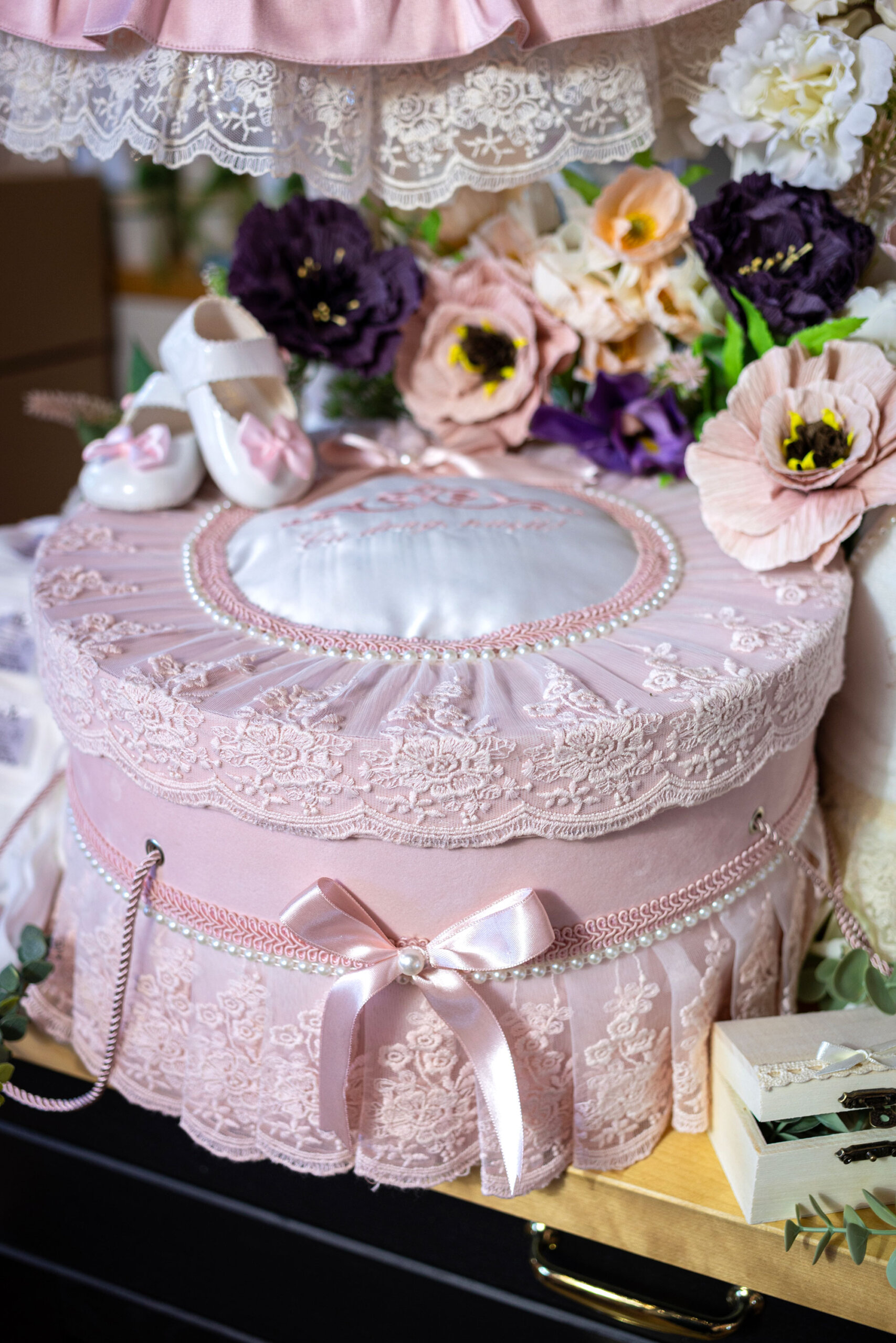 Transformă momentul special al botezului într-o amintire de neuitat cu acest cufăr vintage elegant, decorat cu dantelă delicată și volane rafinate.