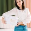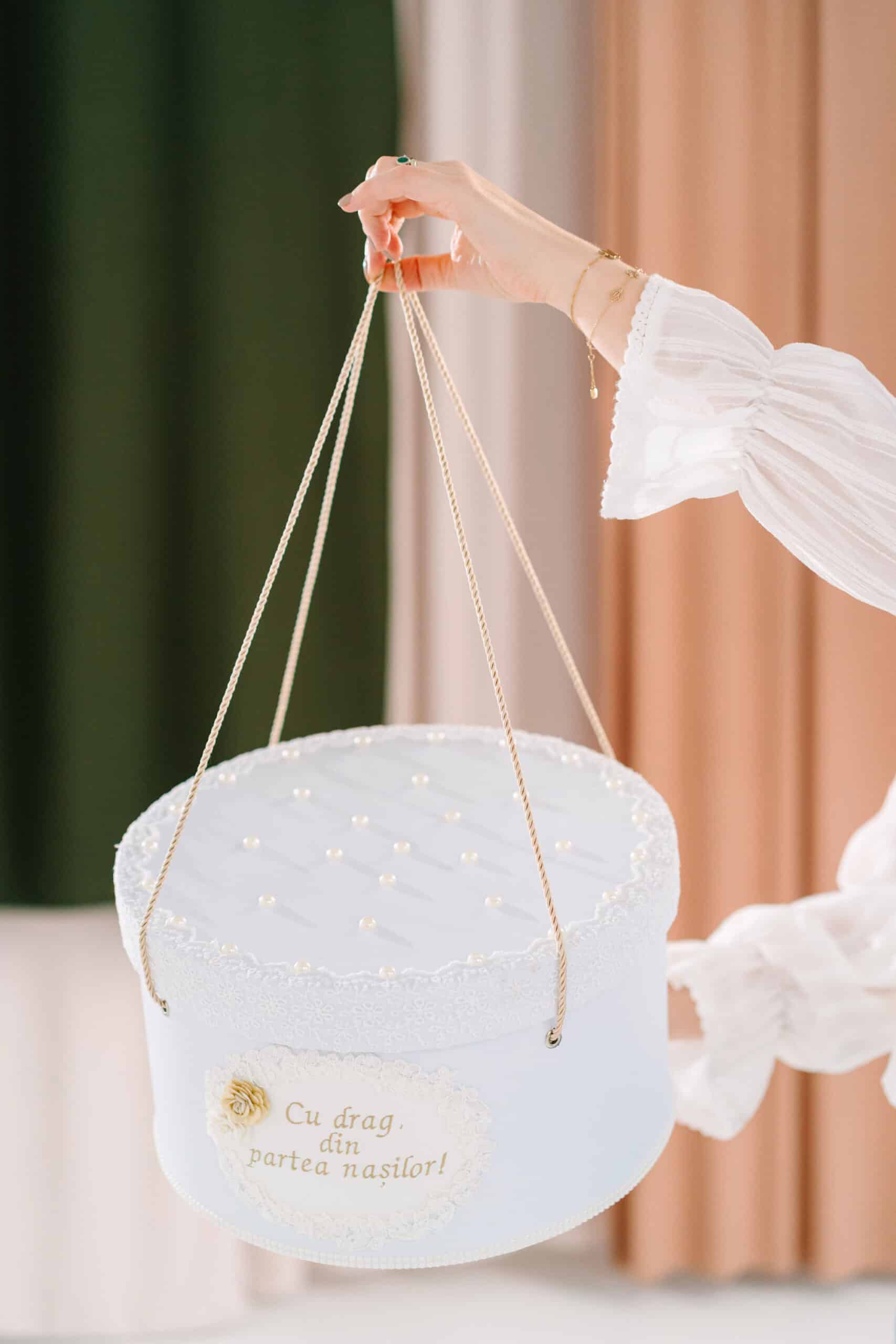 Cutie decorată handmade pentru hăinuțe și accesorii botez, cutie transport piese botez.