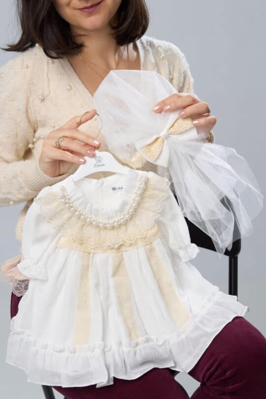 Rochiță rafinată, manufacturată din voal spumos cu textură mătase, rochiță împodobită cu dantele și perle.