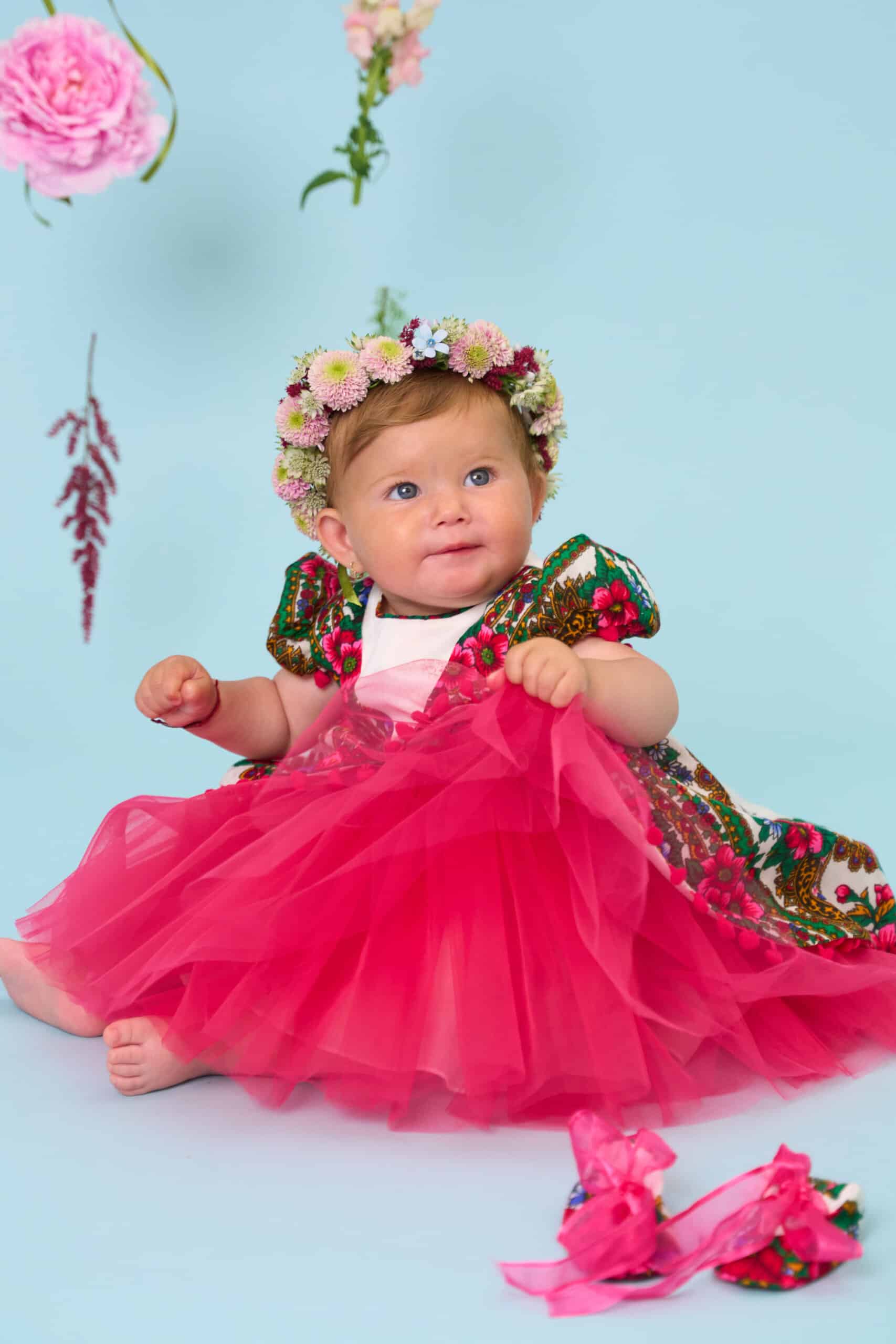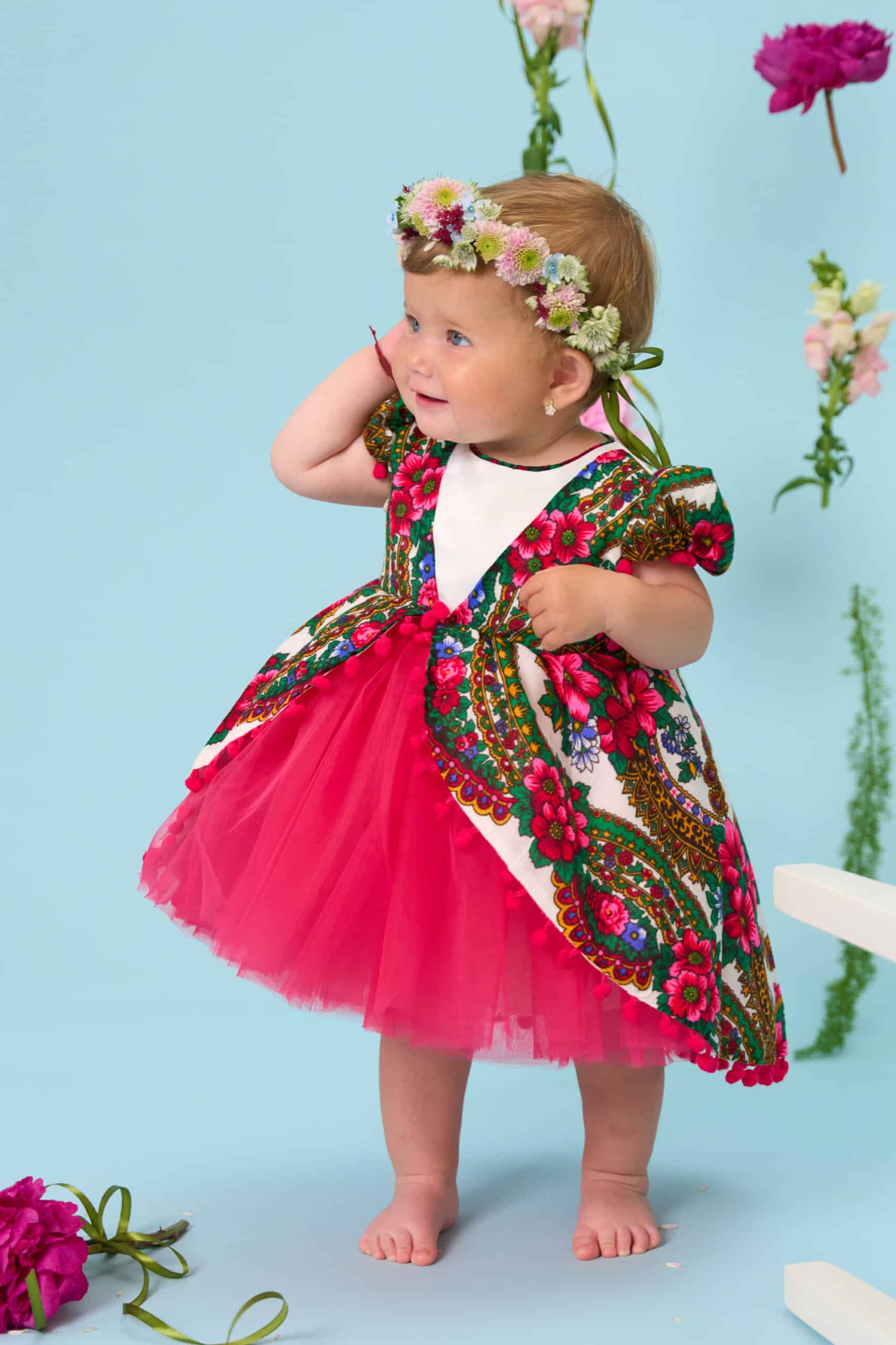 Rochița cu tull creț și bogat pare o floare învăluită in petale și ciucuri.