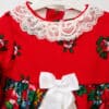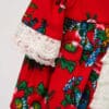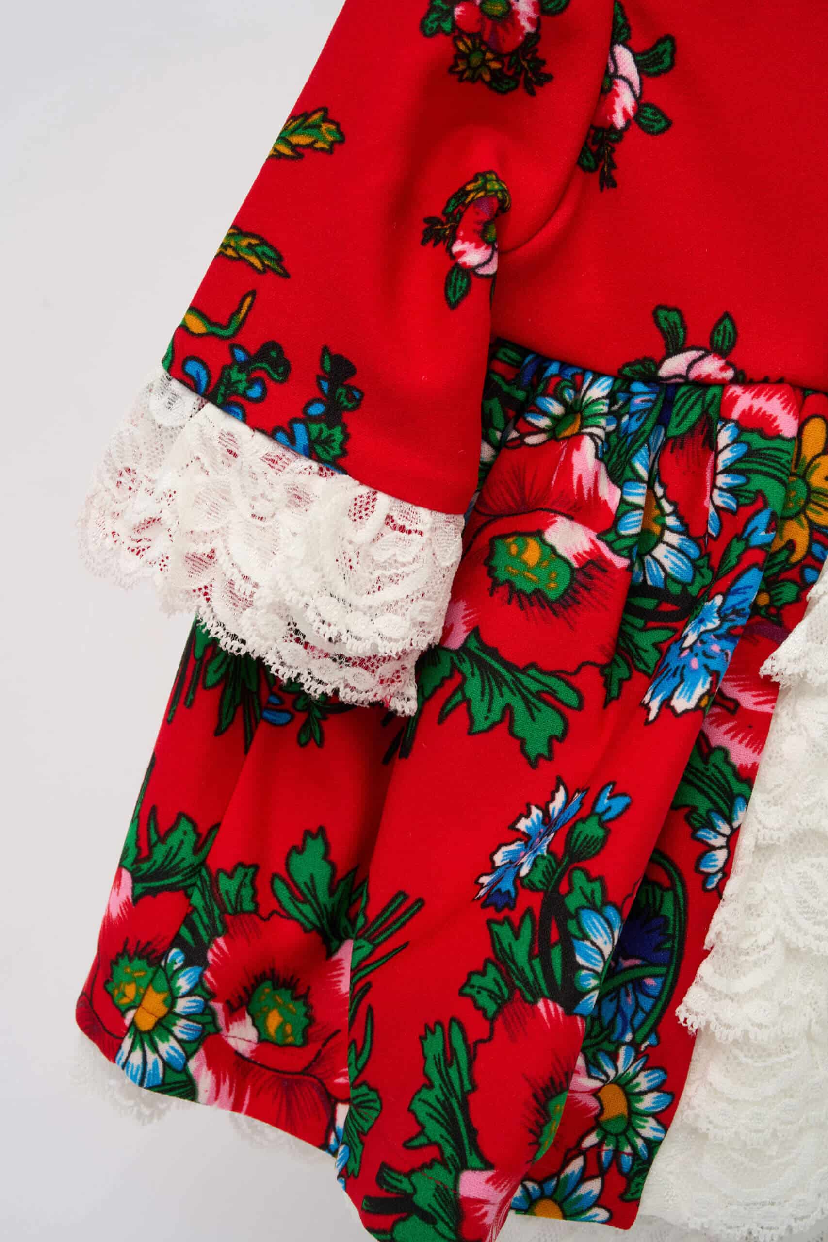 Florile mari pictate pe câmp roșu și dantelele crețe creează un tablou clasic, victorian.