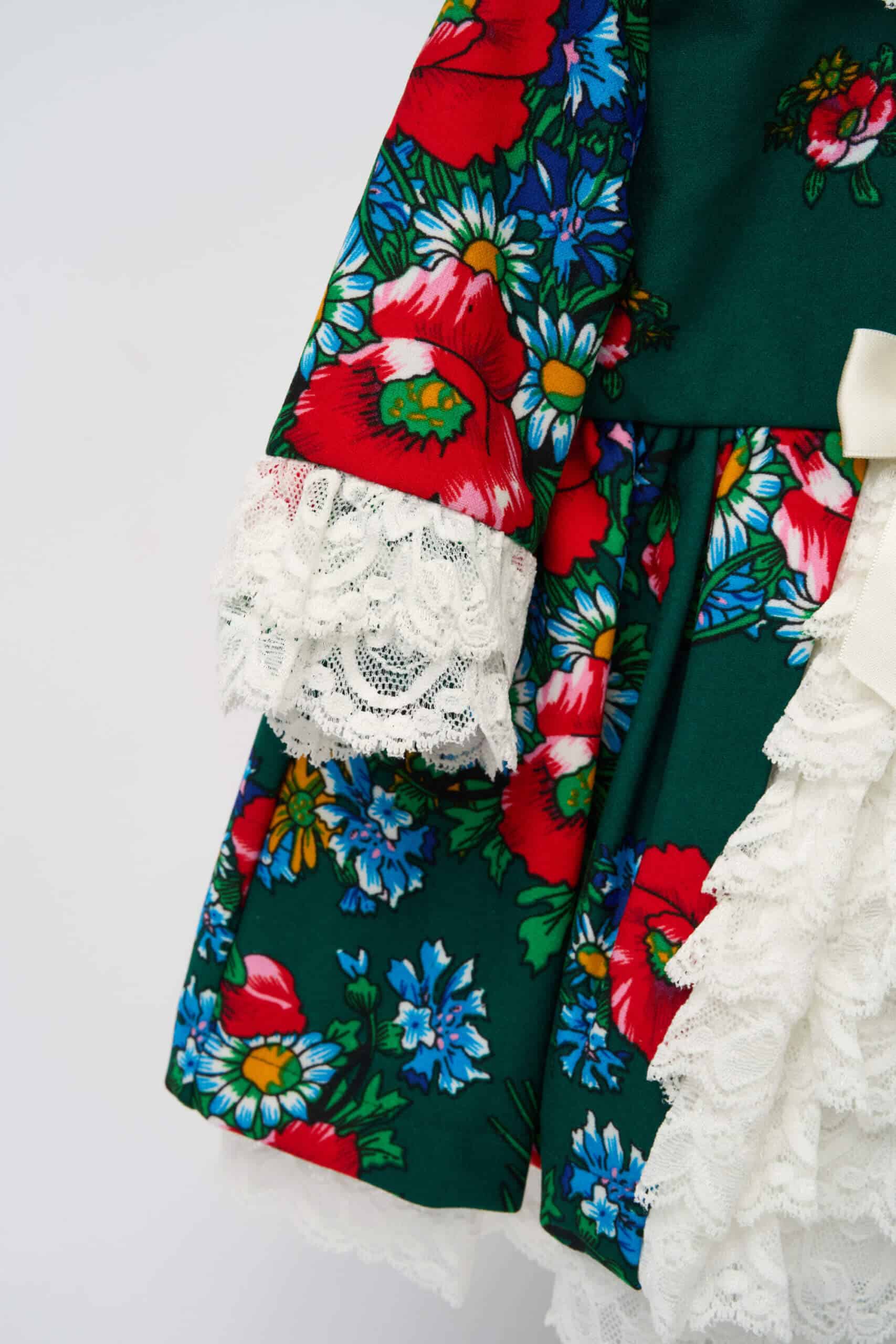 Florile mari pictate pe câmp verde și dantelele crețe creează un tablou clasic, victorian.