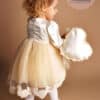 Rochița este o singură piesă și are un croi special ce dă impresia unei pelerine de zână peste o fustă din tull.