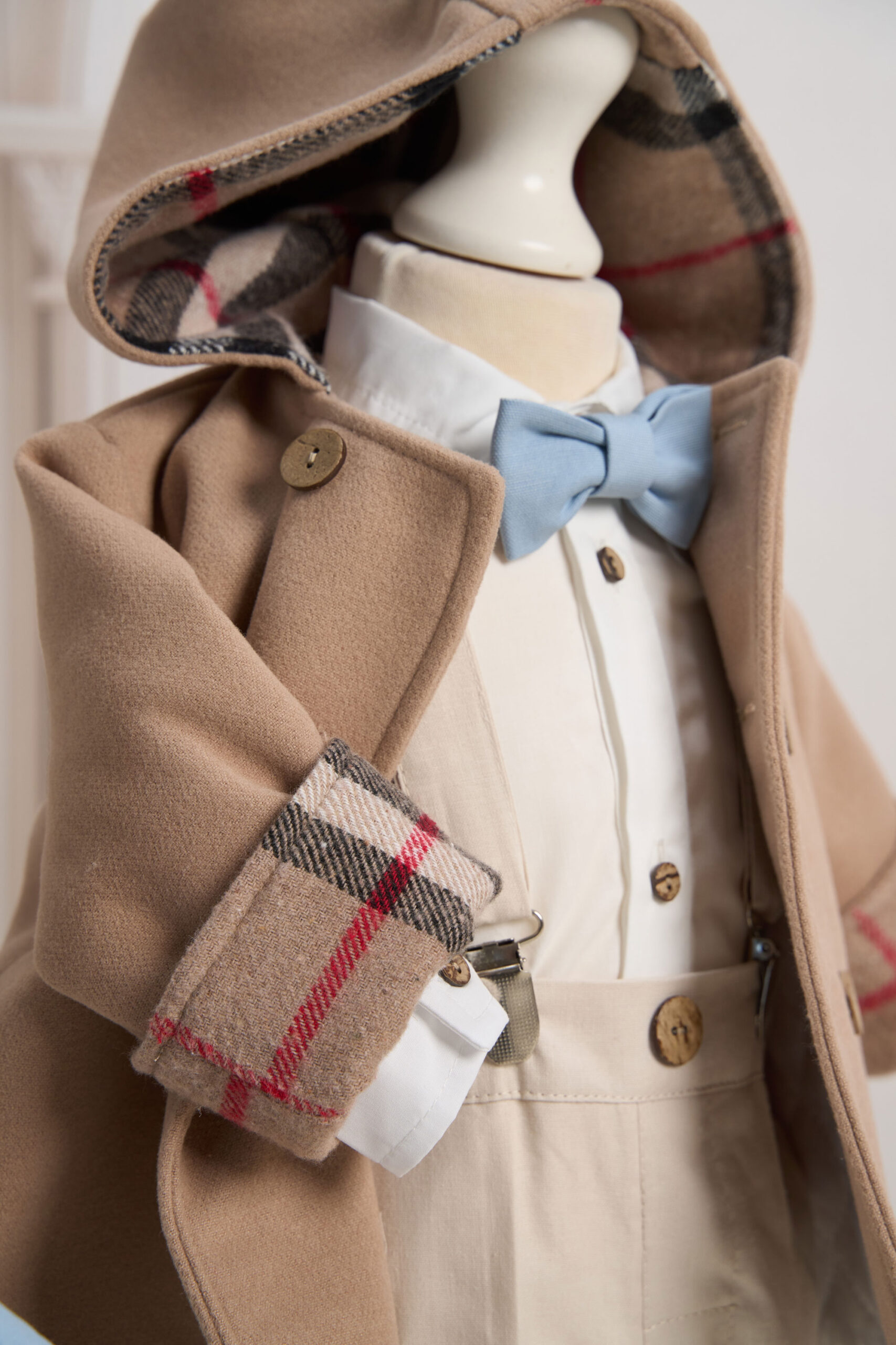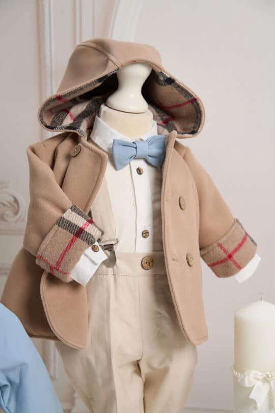 Croiala clasică, închisă cu nasturi din lemn și gluga căptușită, aduc un aer delicat, dar distins — perfect pentru botez, aniversări sau evenimente speciale.