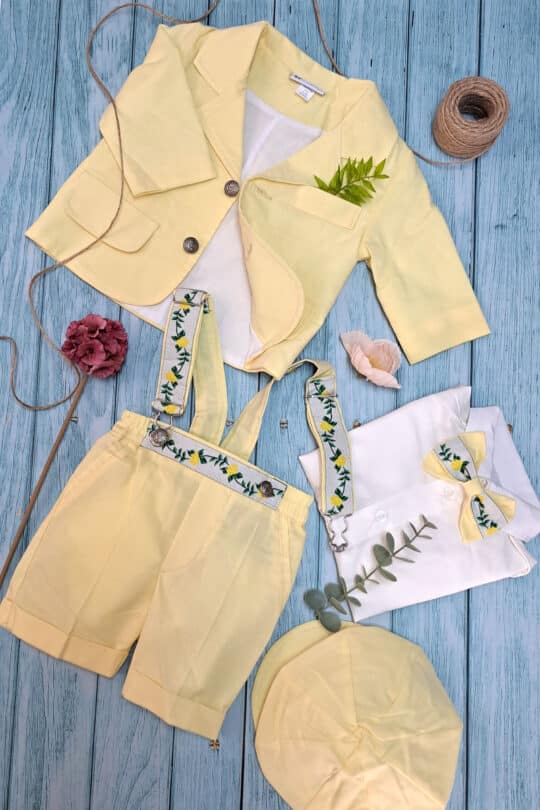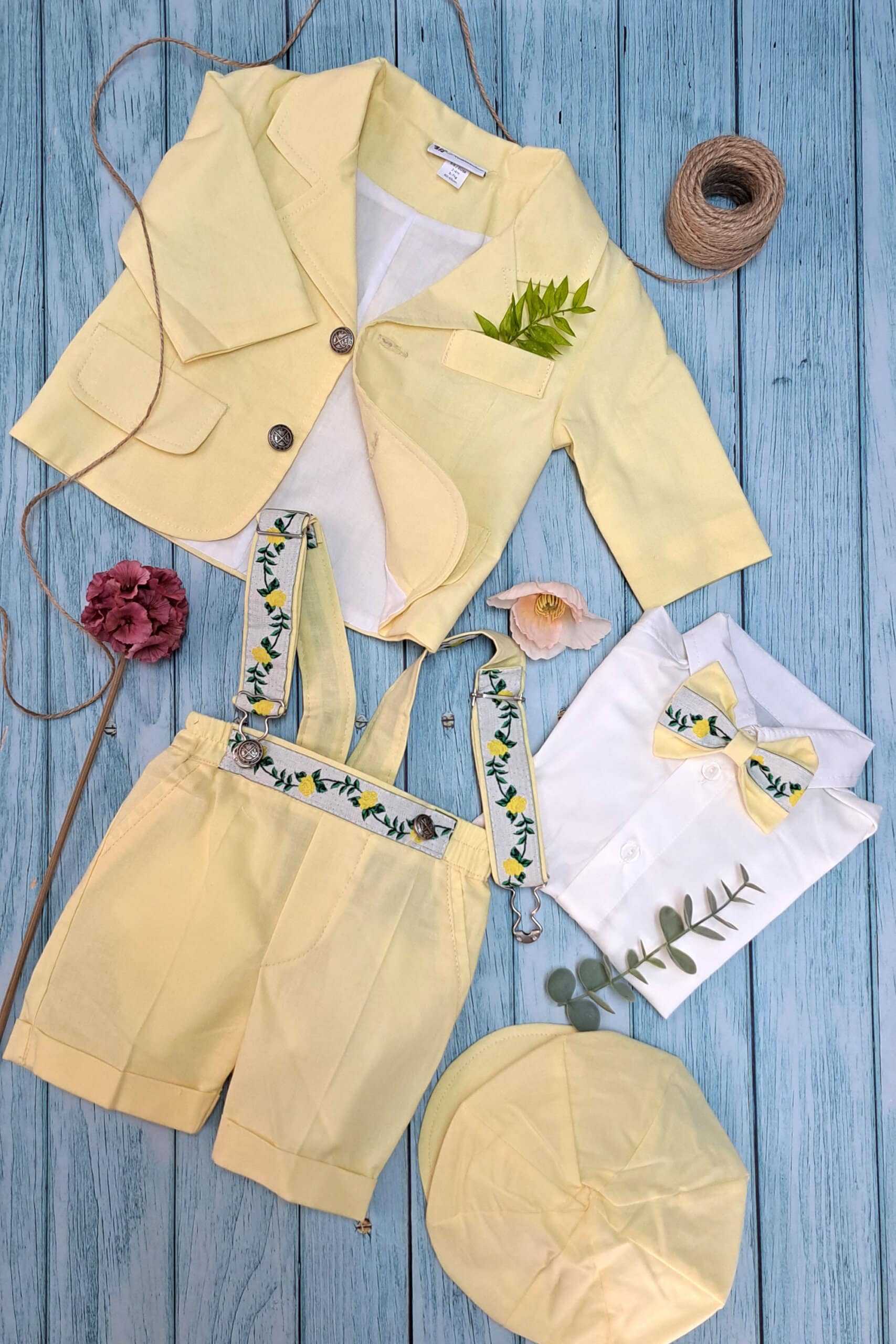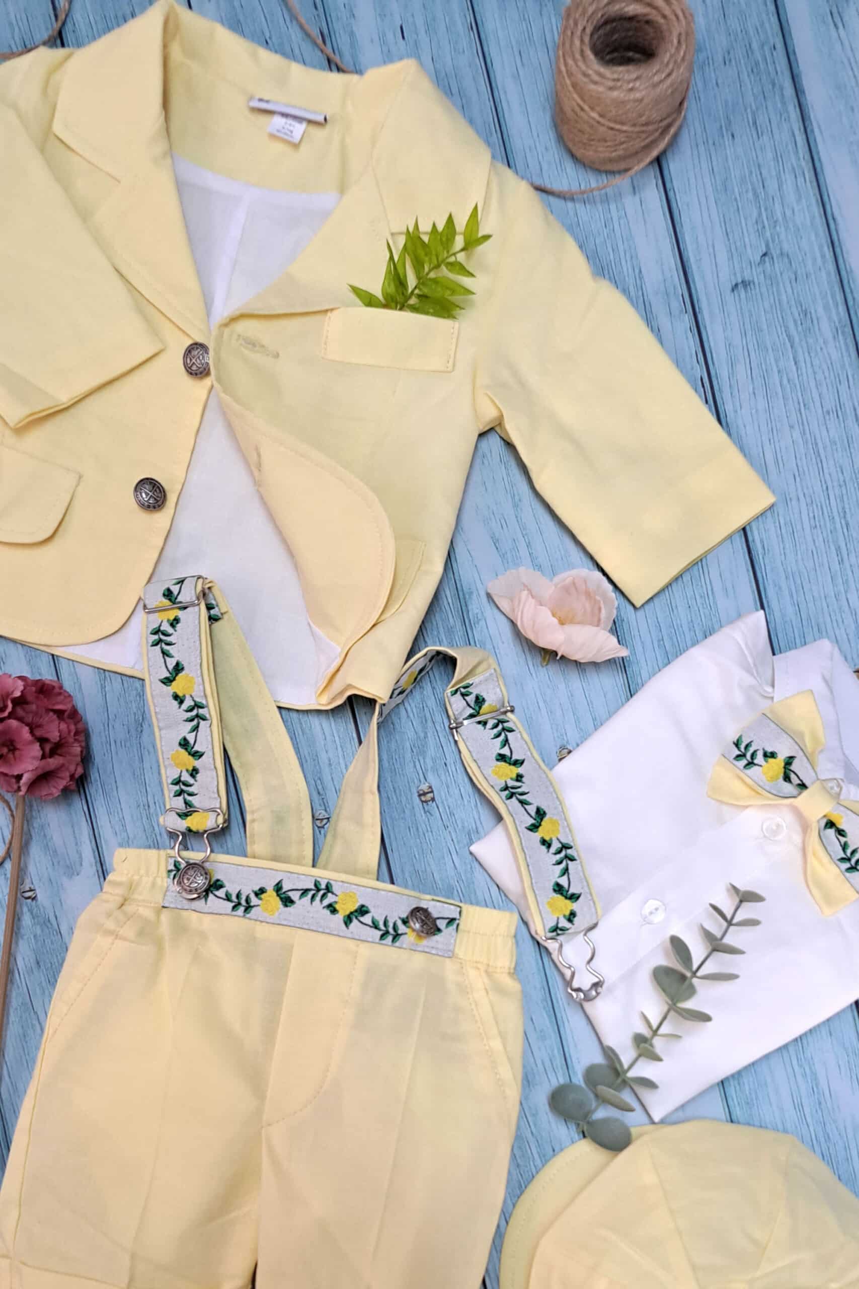 Costumul de botez conține 5 piese: pantaloni cu bretele, sacou, cămașă, pălăriuță, papion