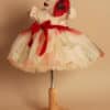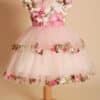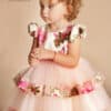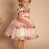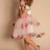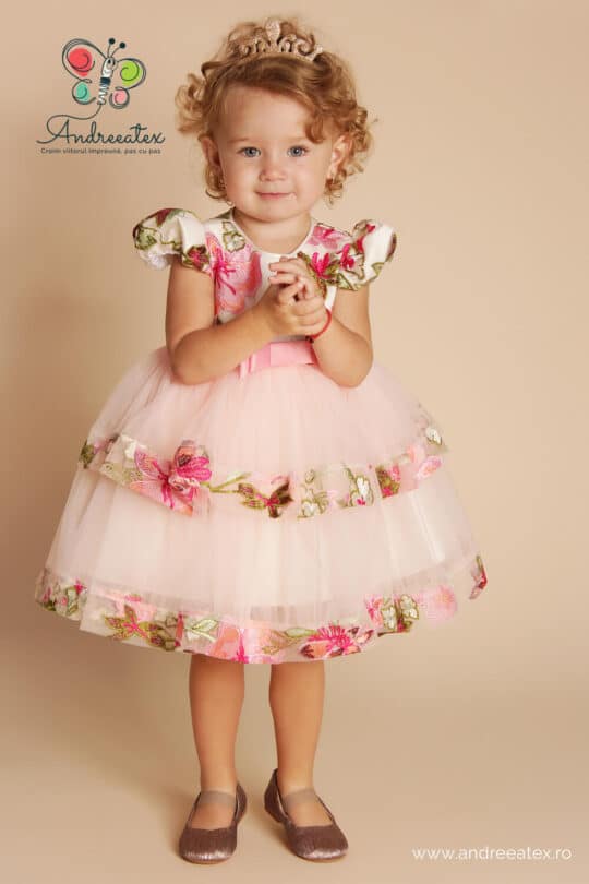 Rochiță cu volane, jucăușe și colorate. Volanele crețe se mișcă ușor creând volum rochiței. Silueta rochiței este tip prințesă, este vie coloristic și dinamică.