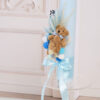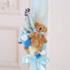 👦🏻 Model bleu serenity – Pentru băieței, lumânarea este accesorizată în tonuri de albastru, alb și bej, perfect armonizate cu fundița satinată bleu și decorul floral discret.