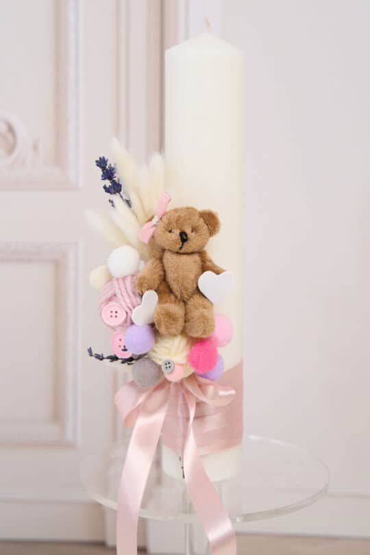 Disponibile în variante pentru fetițe și băieței, fiecare lumânare este decorată cu un ursuleț adorabil din pluș, accente pastelate, fundițe din satin, lavandă naturală și elemente textile moi, ce adaugă un aer jucăuș și elegant în același timp.