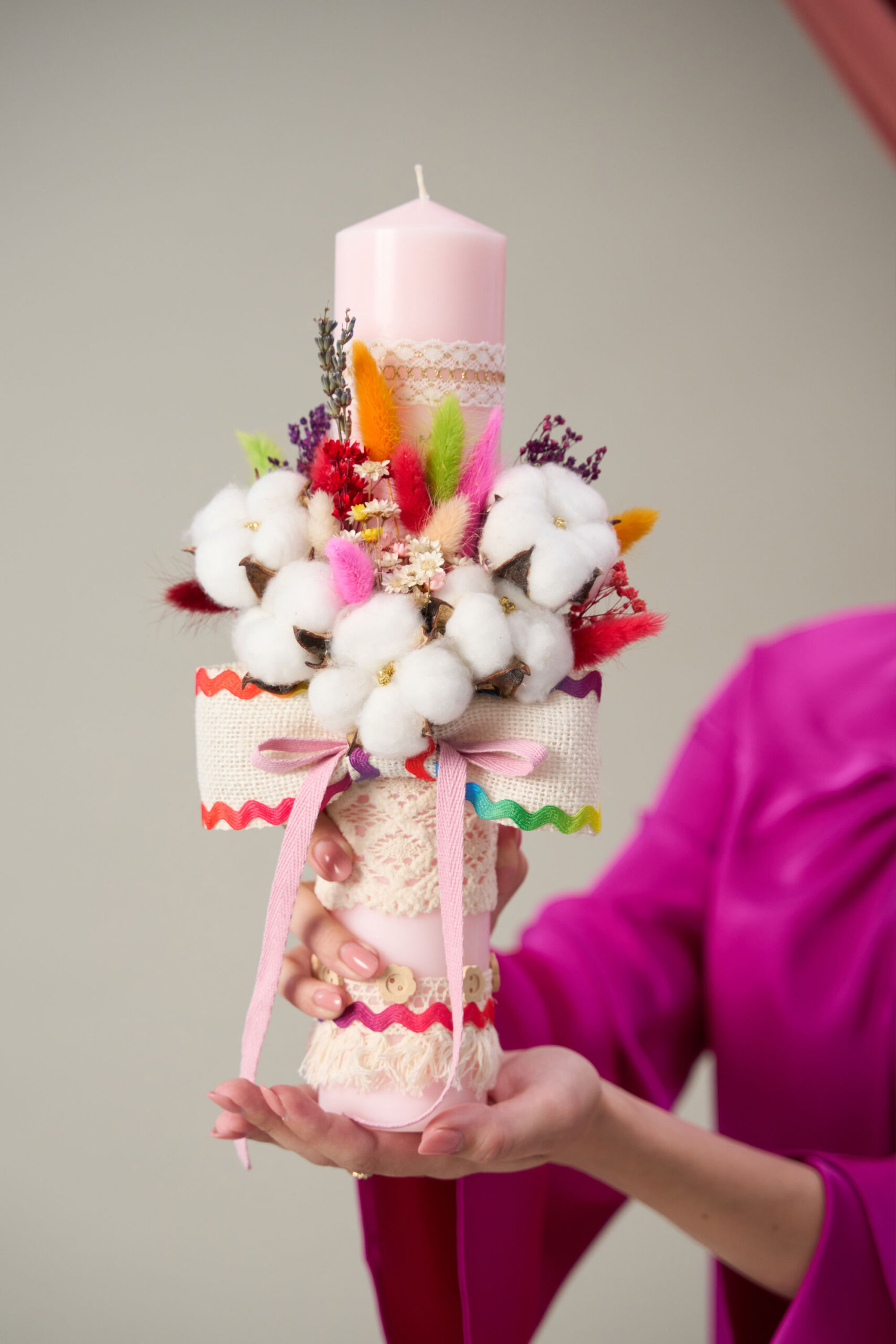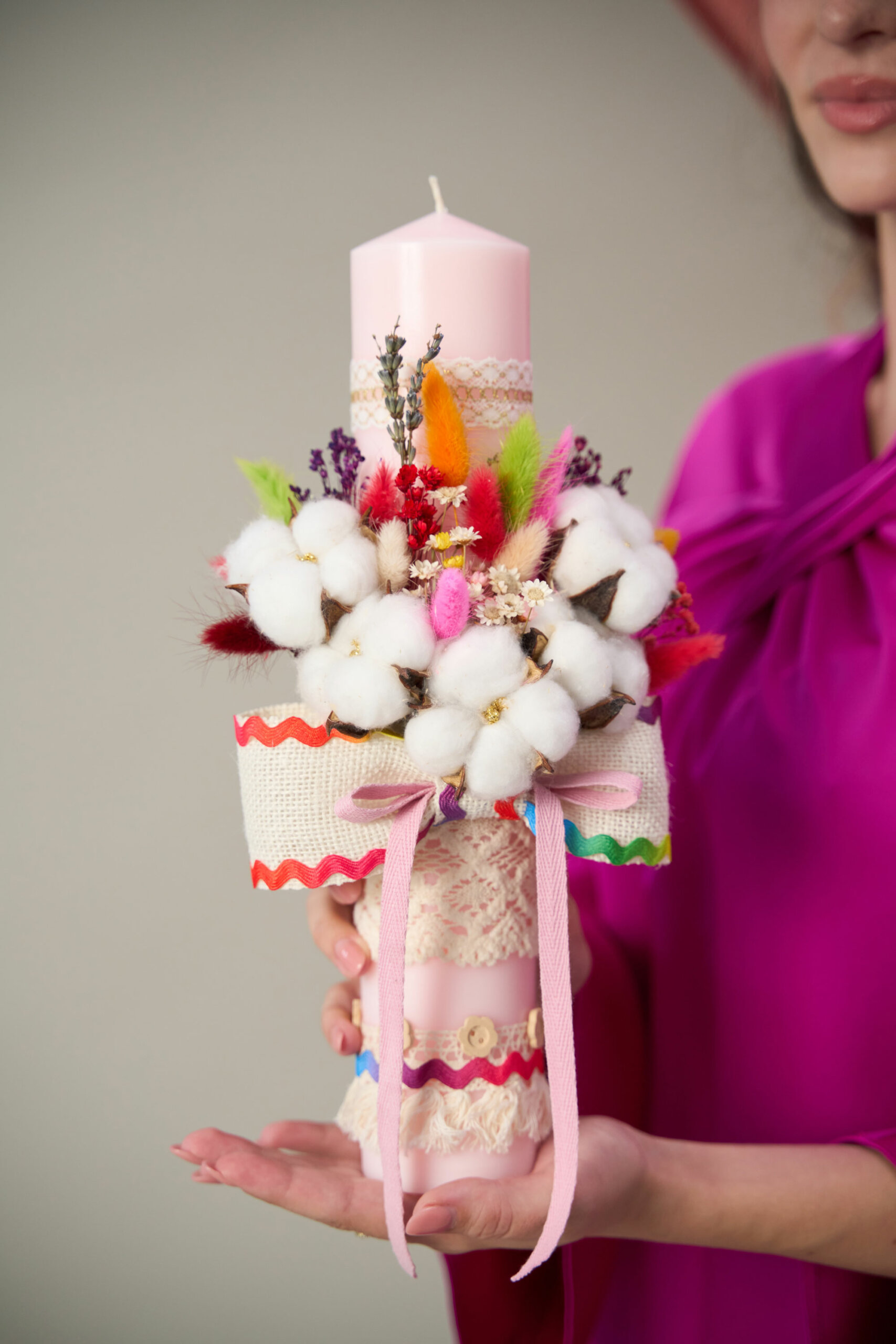 Lumânarea este disponibilă în două variante de culoare – bleu și roz.