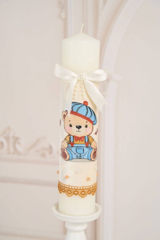 Lumânare botez A24 – Ursuleț Broderie – Ivoire