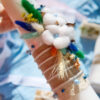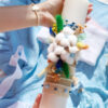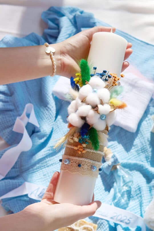Decorată cu panglici viu colorate și elemente naturale ca flori de bumbac, dantelă și panglici, aduce un plus de prospețime ceremoniei de botez.