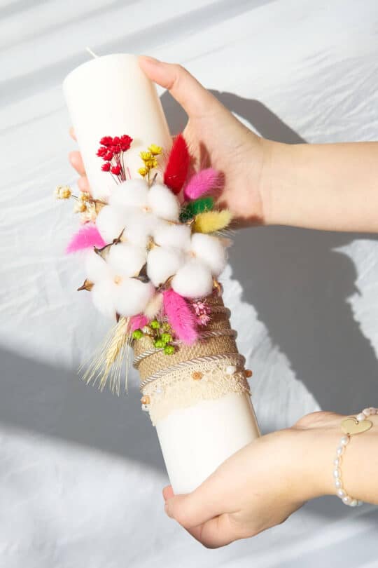 Lumânarea este disponibilă în două variante de culoare – bleu și roz.
