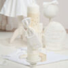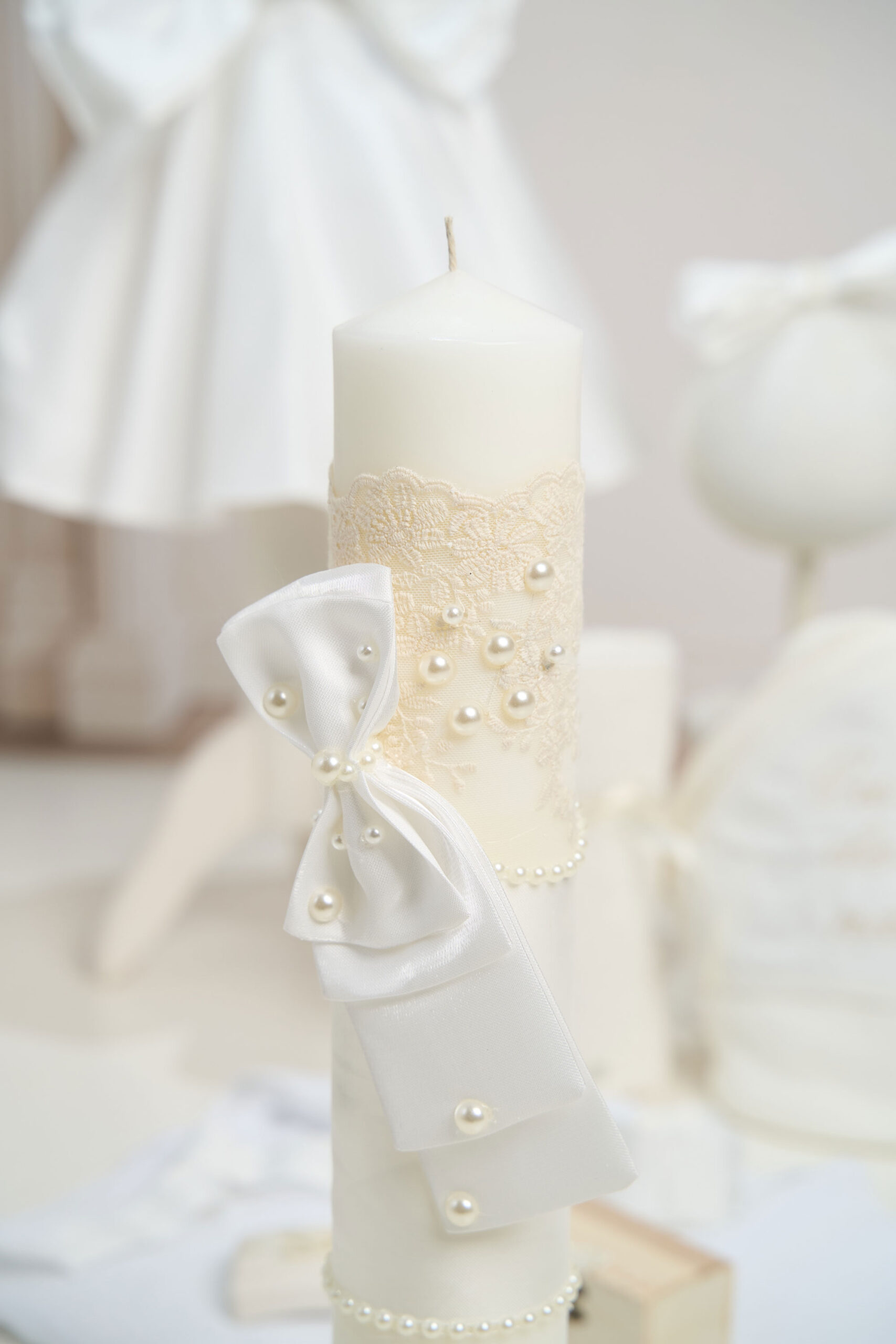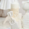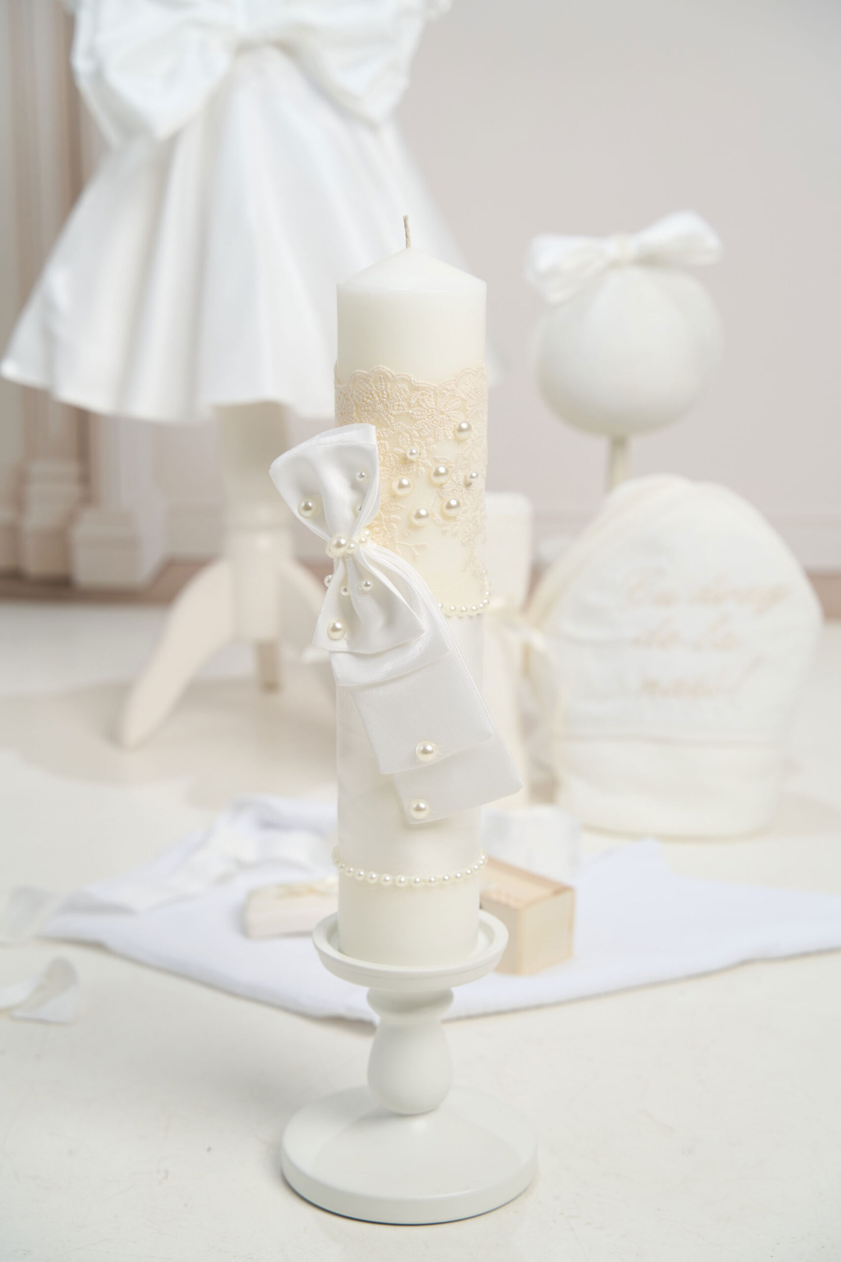 Lumânare de botez cu dantelă fină și fundă elegantă cu perle – un model rafinat, creată pentru botez.