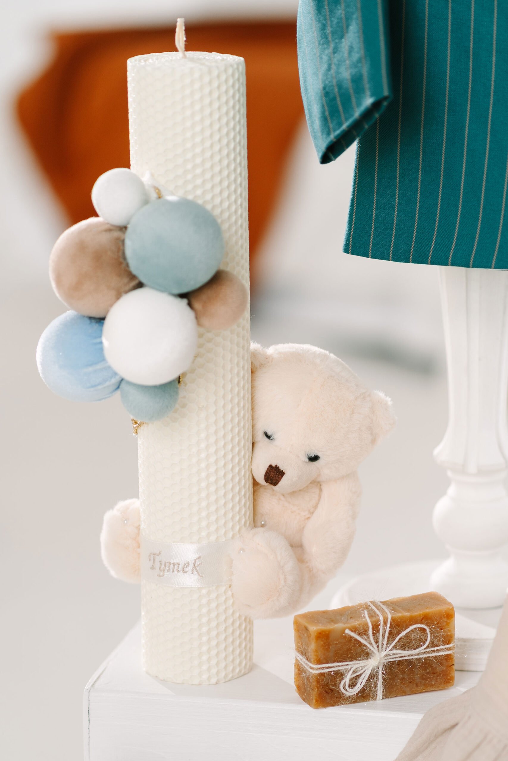 Decorată cu un ursuleț de pluș adorabil și un buchet vesel de baloane textile în tonuri pastelate, această lumânare aduce un strop de gingășie și rafinament în ziua botezului.