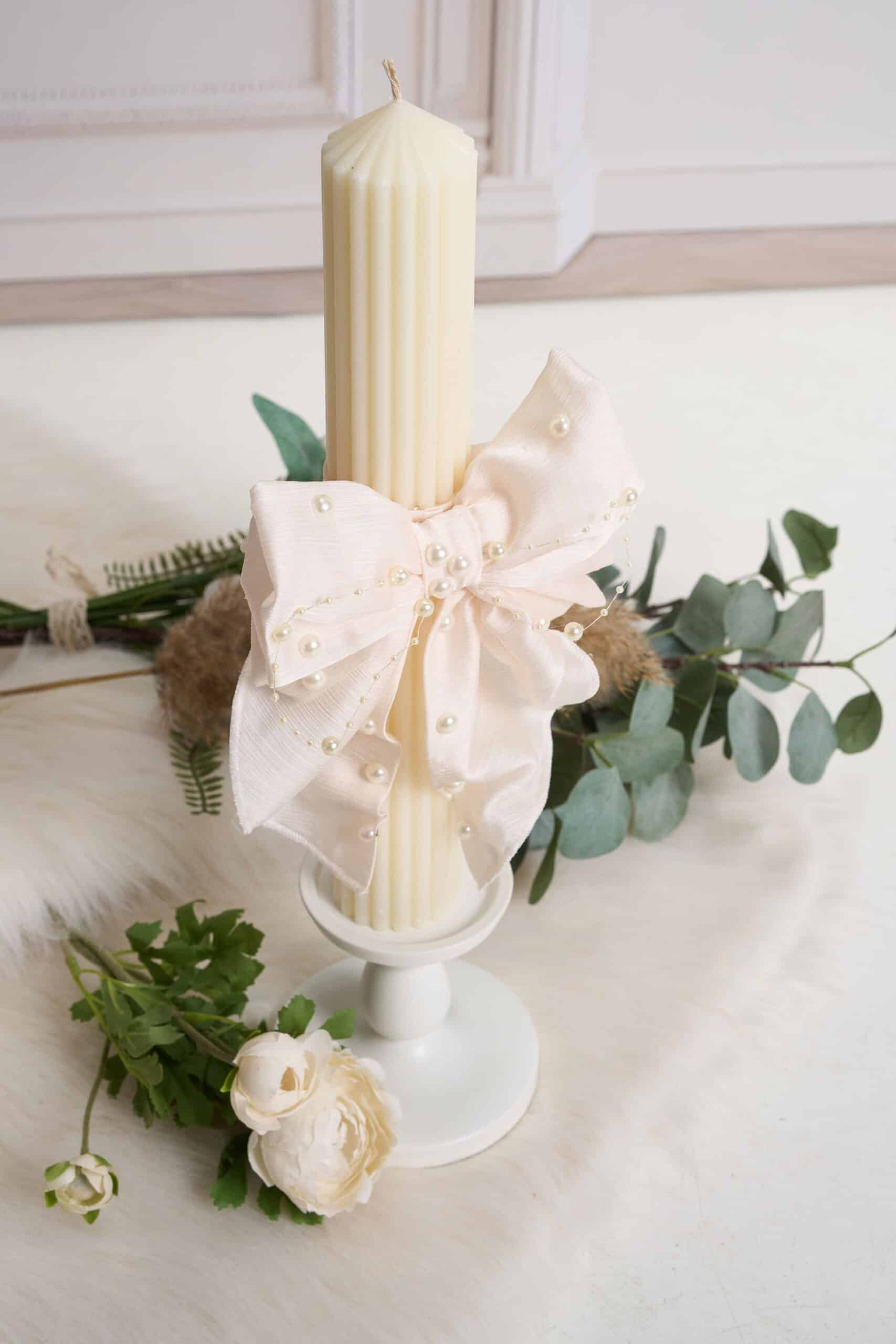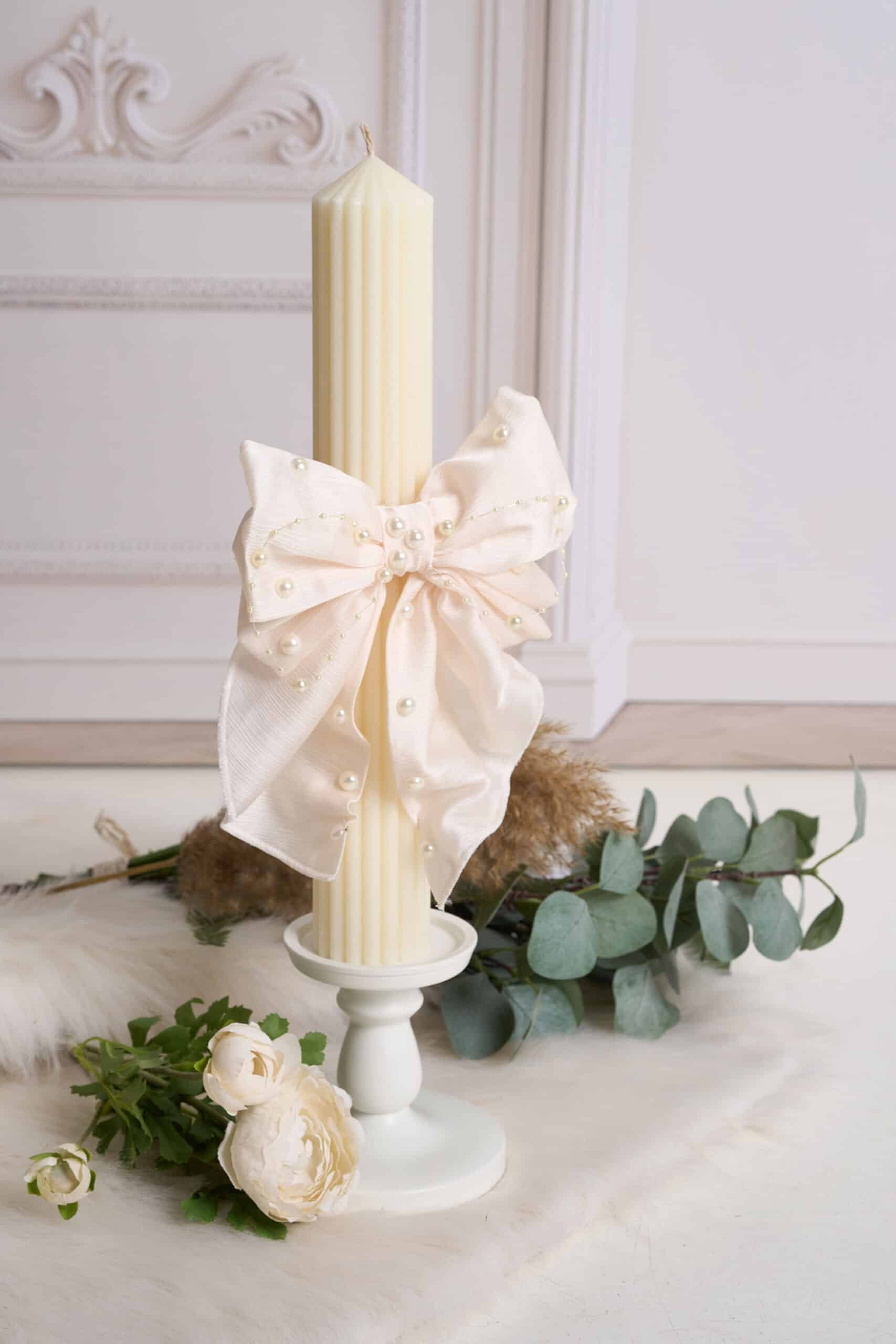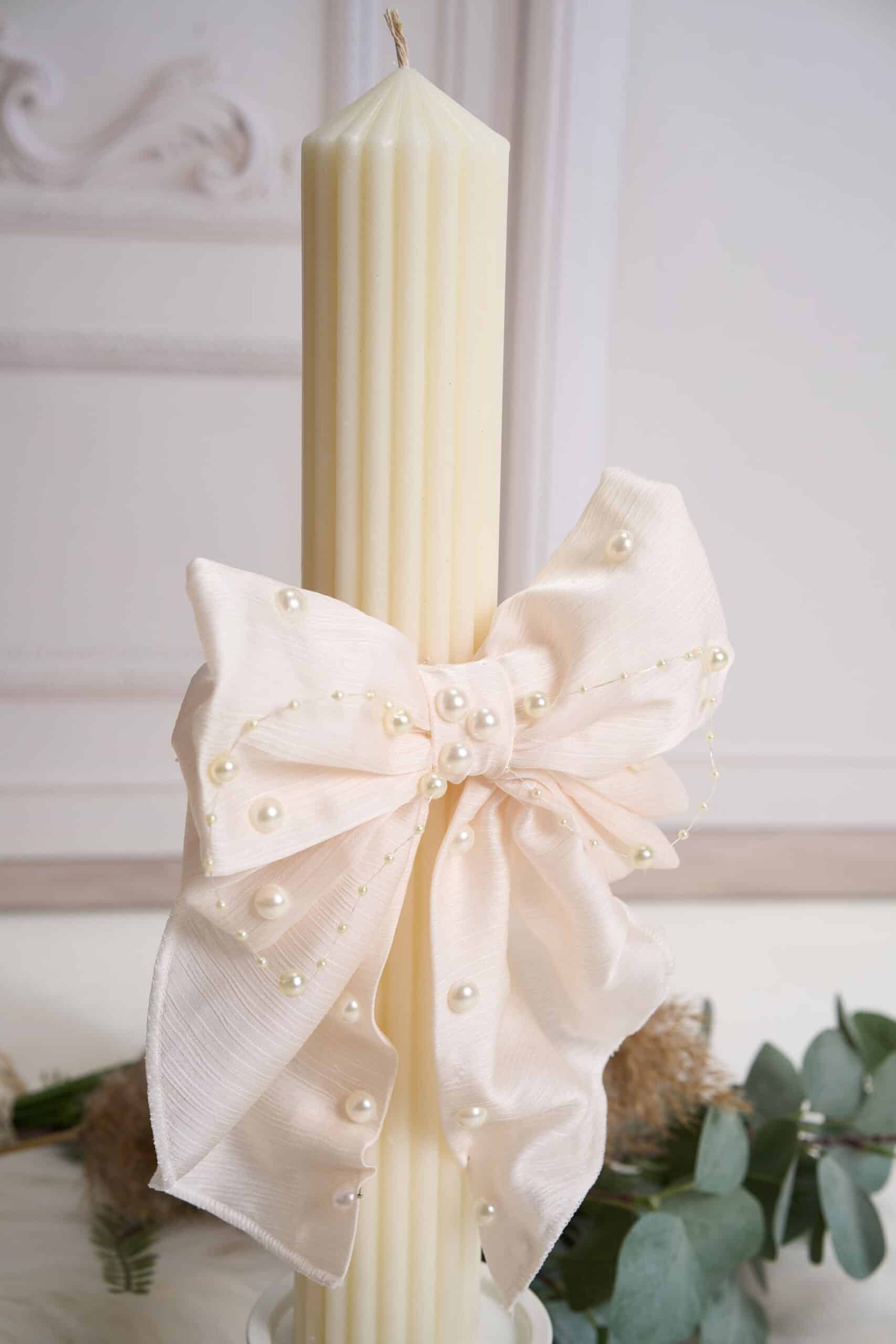 Lumânare botez A33 cu fundă elegantă și perle – grej