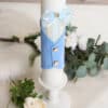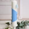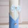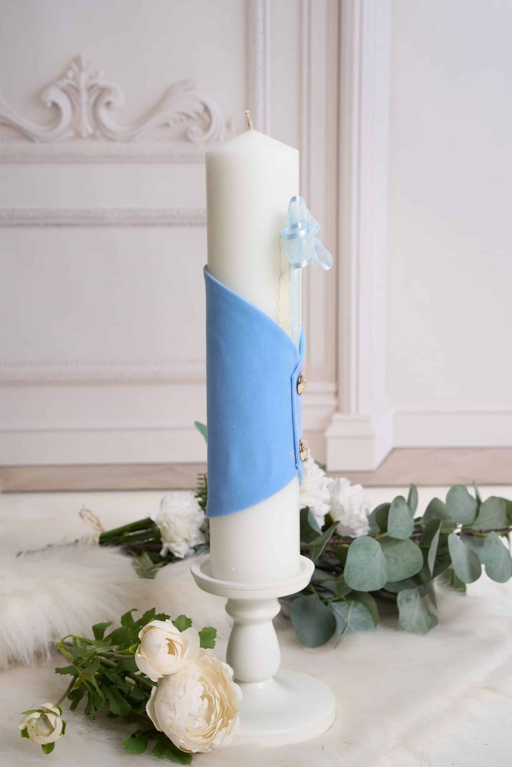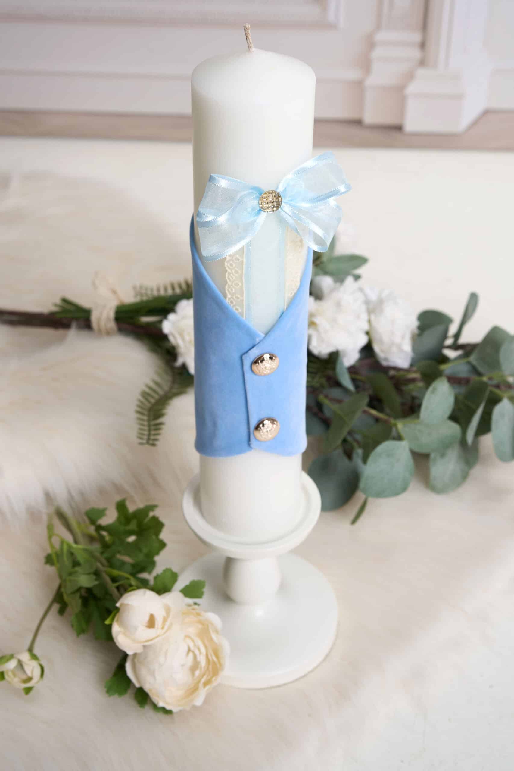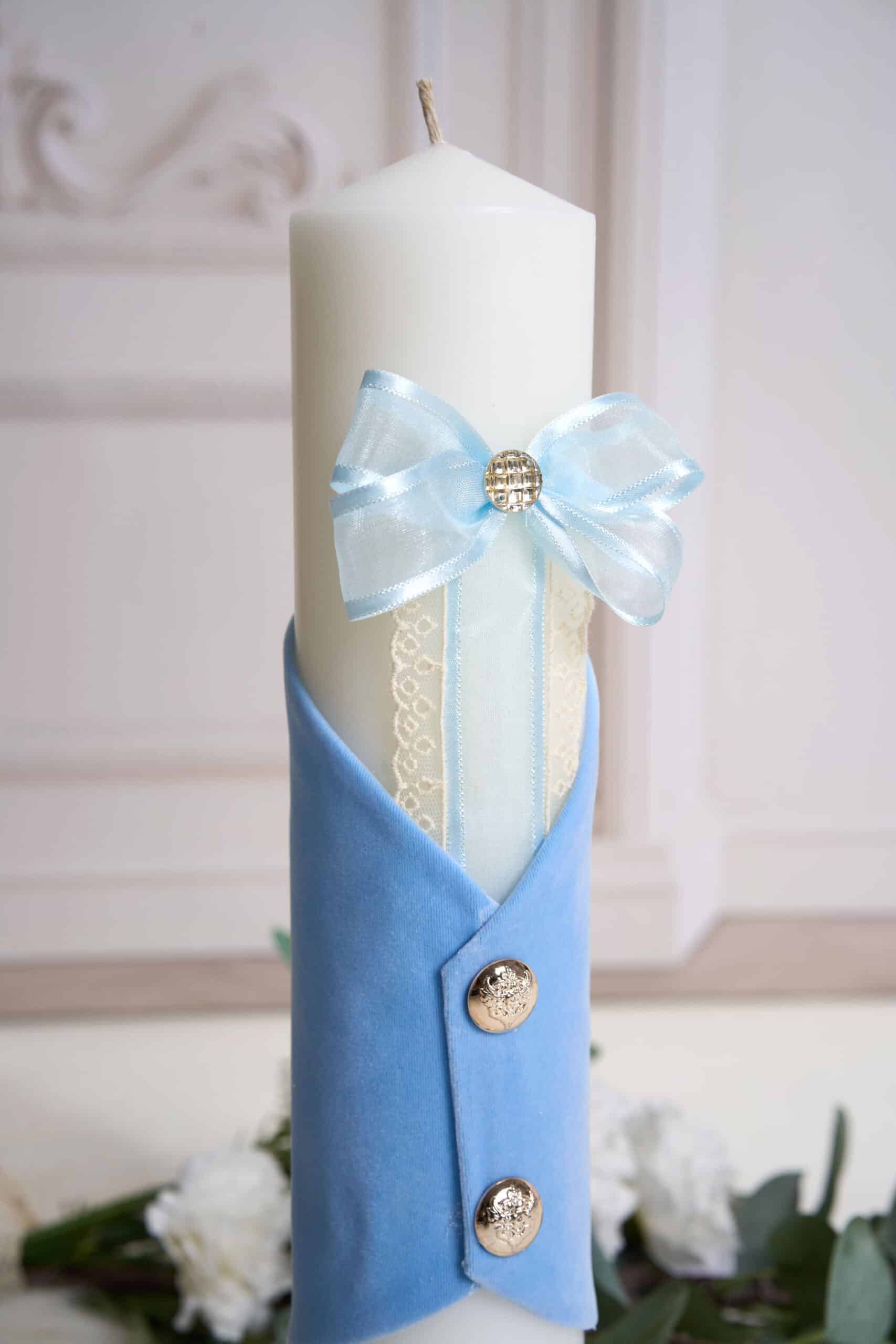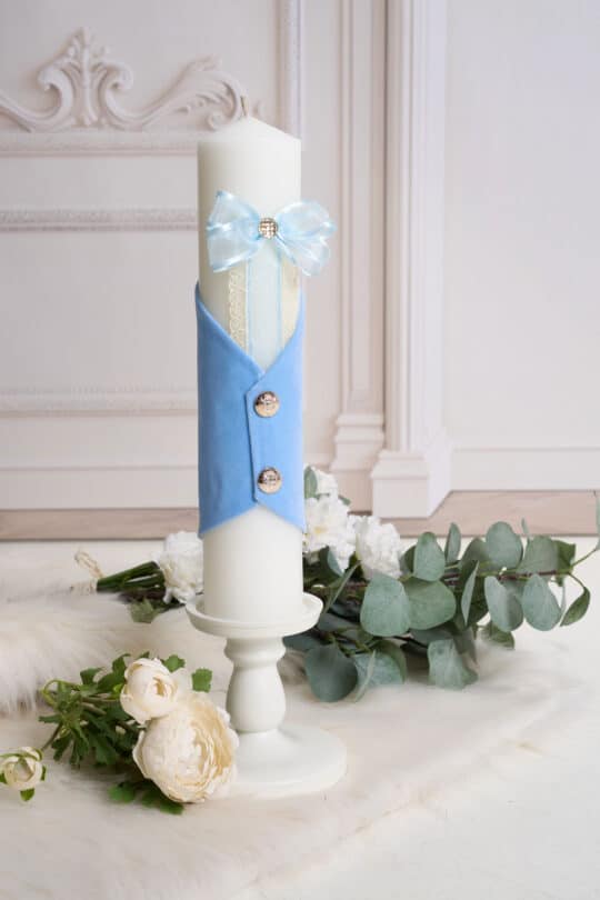 Lumânarea este îmbrăcată în catifea fină bleu, croită sub forma unei veste rafinate, completată de nasturi aurii cu detalii delicate. Accesoriul principal, o fundă vaporoasă din organza bleu cu centru auriu, adaugă un plus de gingășie și lumină, oferind întregului ansamblu o notă nobilă și pură.
