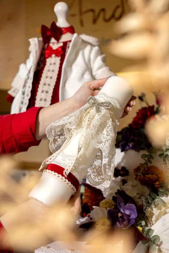 Lumânare delicată pentru botez cu accent roșu
