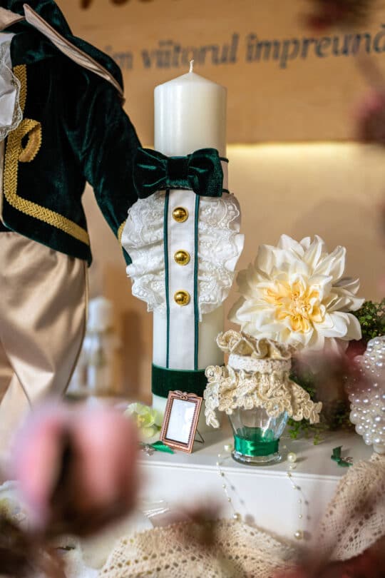 Lumânările pentru botez sunt special concepute pentru hăinuțele Andreeatex, lumânările sunt creații de serie mică și unicat. Tulluri diafane și jucăușe, culori pastelate, perluțe mici, jabouri crețe și nasturi ornament, toate aceste detalii crează un întreg tablou creeativ al artistului făuritor de lumânări.