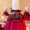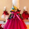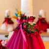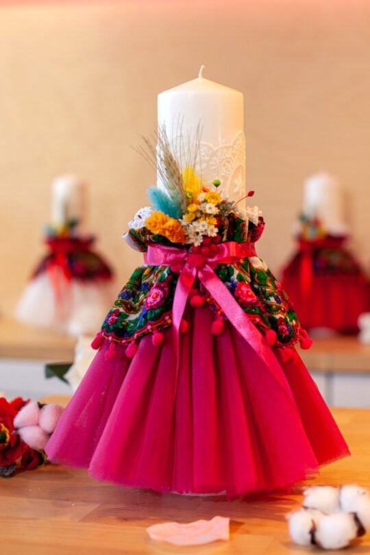 Lumânare cu imprimeu folclor în varianta de culoare cu tull mov și flori nemuritoare prinse în buchețel, aceste lumânări sunt asortate cromatic modelului de rochiță Eniko.
