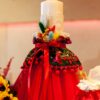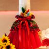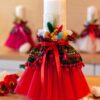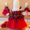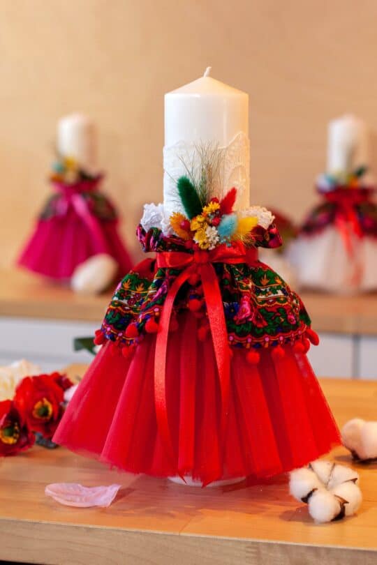 Lumânare cu imprimeu folclor în varianta de culoare cu tull roșu și flori nemuritoare prinse în buchețel, aceste lumânări sunt asortate cromatic modelului de rochiță Eniko.