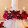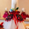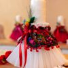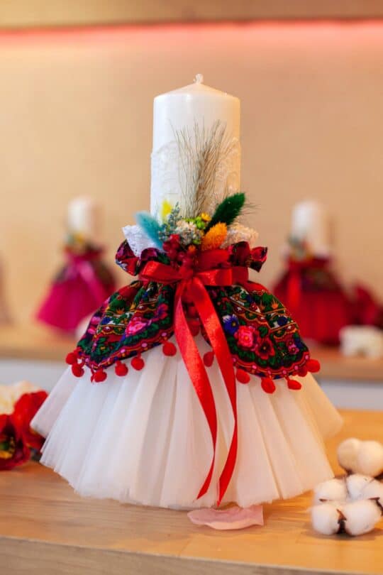 Lumânare cu imprimeu folclor în varianta de culoare cu tull ivoire și flori nemuritoare prinse în buchețel, aceste lumânări sunt asortate cromatic modelului de rochiță Eniko.