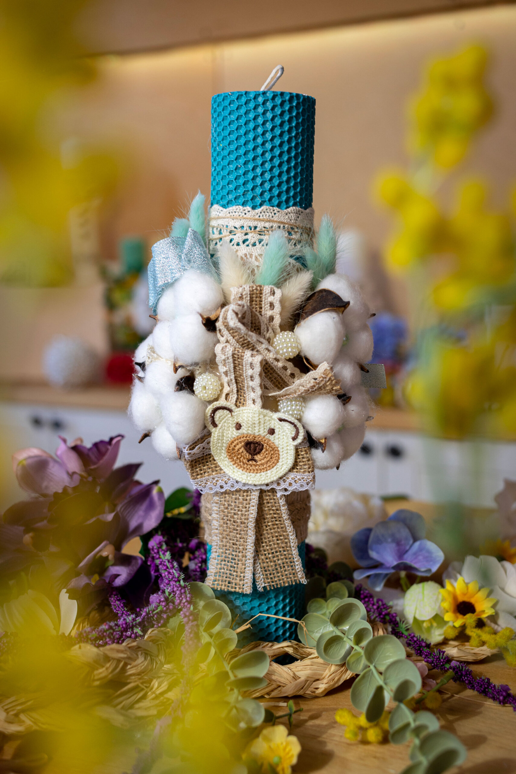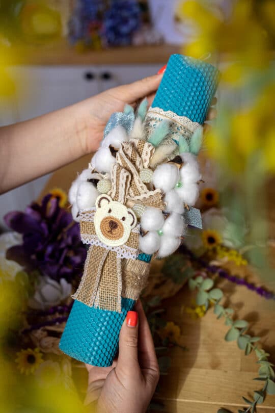 Lumânare botez Ursuleț – ceară naturală Blue Sky