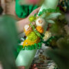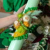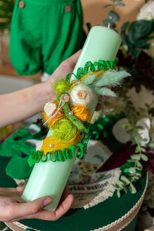 Lumânare pentru botez din parafină cu decor rafie, gheme din ață strălucitoare colorată, nasturi lemn și ornament lemn la nuanța decorului.