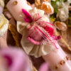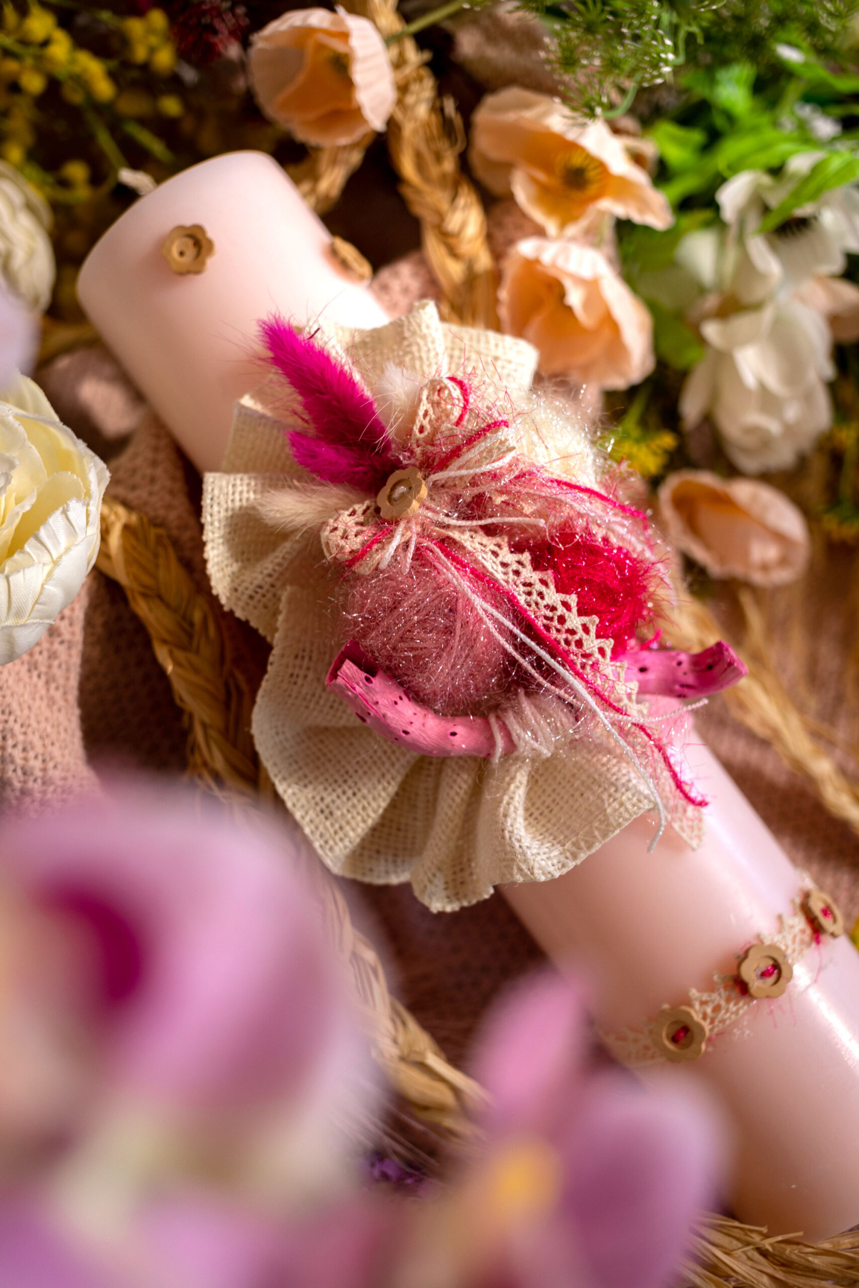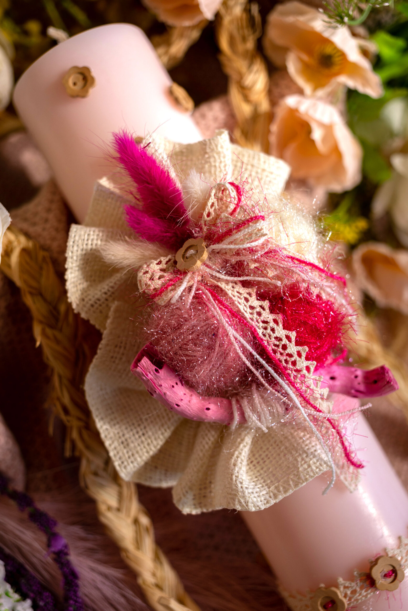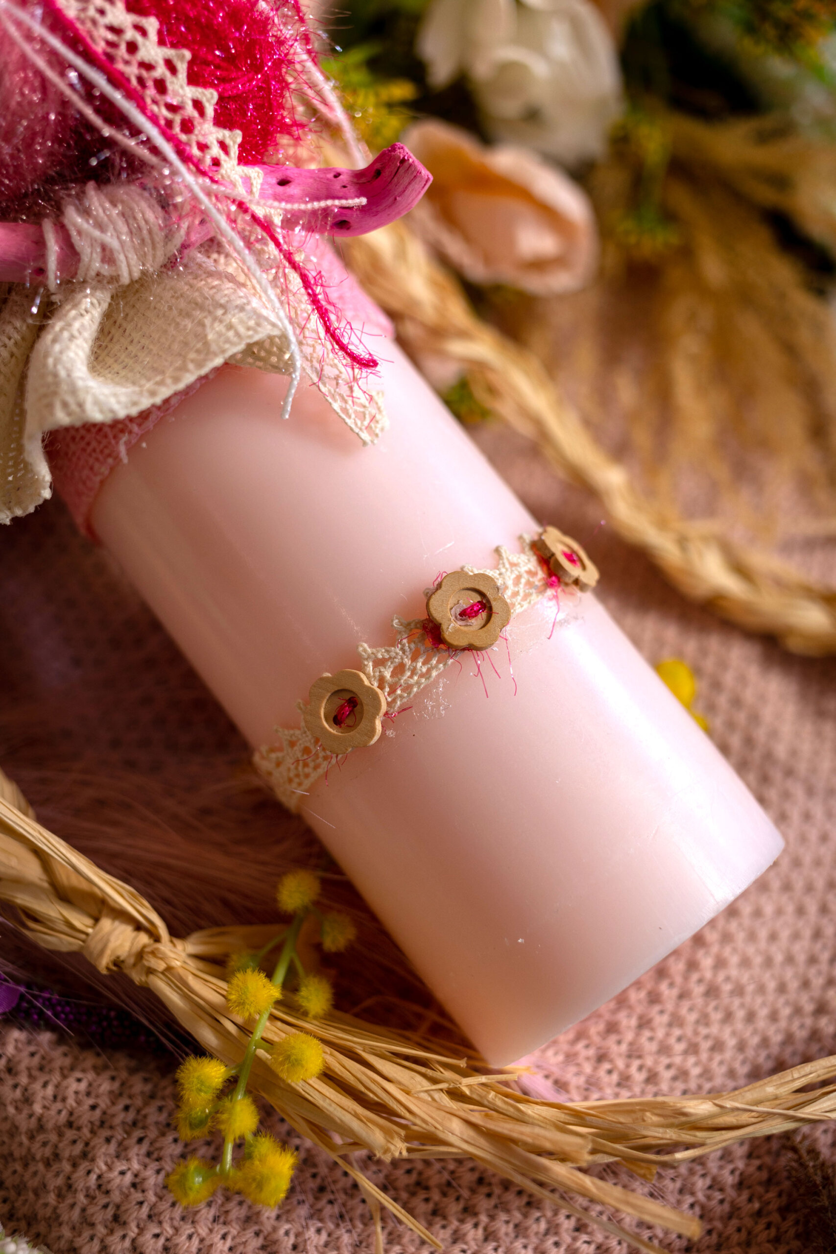 Lumânare pentru botez din parafină cu decor rafie, gheme din ață strălucitoare colorată, nasturi lemn și ornament lemn la nuanța decorului.