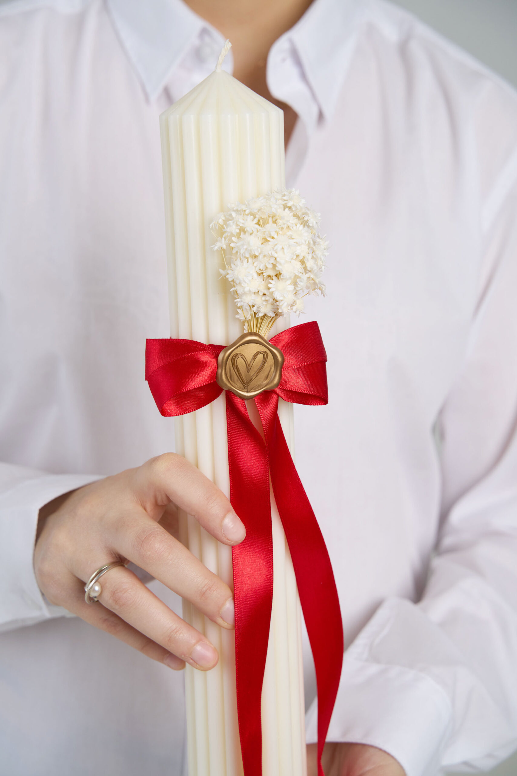 O lumânare de botez creată cu grijă și gânduri bune, decorată cu flori uscate și legată cu o panglică fină, pecetluită cu Sigiliul Dragostei.