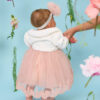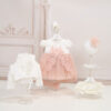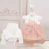 Compleul conține 4 piese: rochiță cu mânecă scurtă, bentiță, bolero, chiloței gogoșari.