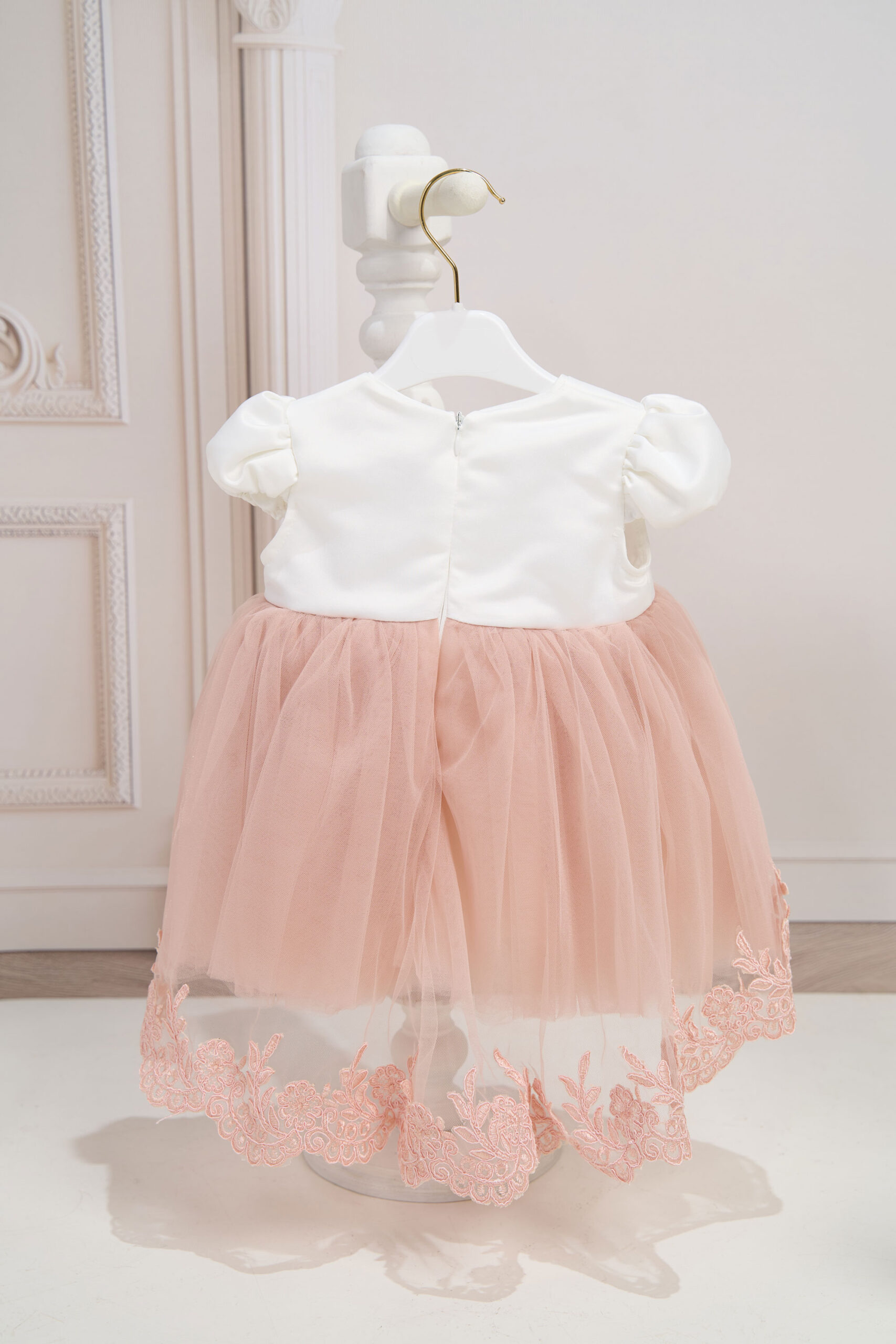 Rochița este confecționată din tafta fină, tull, dantelă, accesorii aplicate manual.