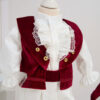 Vestuța este scurtă, din catifea, cu guler rotund, detalii șnur și nasturi aurii.