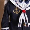 Sacoul costumașului este bleumarin, cu guler specific marinăresc alb și manșete.