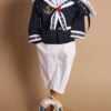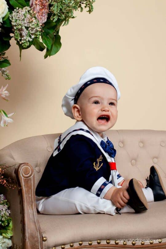 Costumul marinar conține 4 piese: cămașă, sacou, pantaloni, beretă.