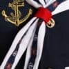 Gulerul se închide într-un nod roșu având rol de accent cromatic, iar sacoul se închide în nasturi cu ancoră aurii.