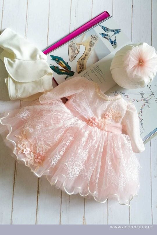 Rochiță manufacturată din dantelă Chantilly, fină, în culoare pastel.