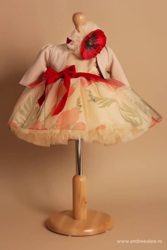 Rochița este confecționată din tull, saten și accesoriu mac bentiță aplicat manual; boleroul este dintr-un material fin, plăcut la atingere, bentița este din tull cu floare și catifea.