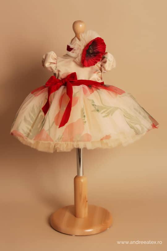 Macii mari creează volum fustiței, iar straturile de tull se pierd în valuri jucăușe de culoarea deșertului. Macul de la bentiță este tușa finală a făuritorului de rochițe, iar rochița este sensibilă ca florile de mac, dar puternică în bogăție și culoare.