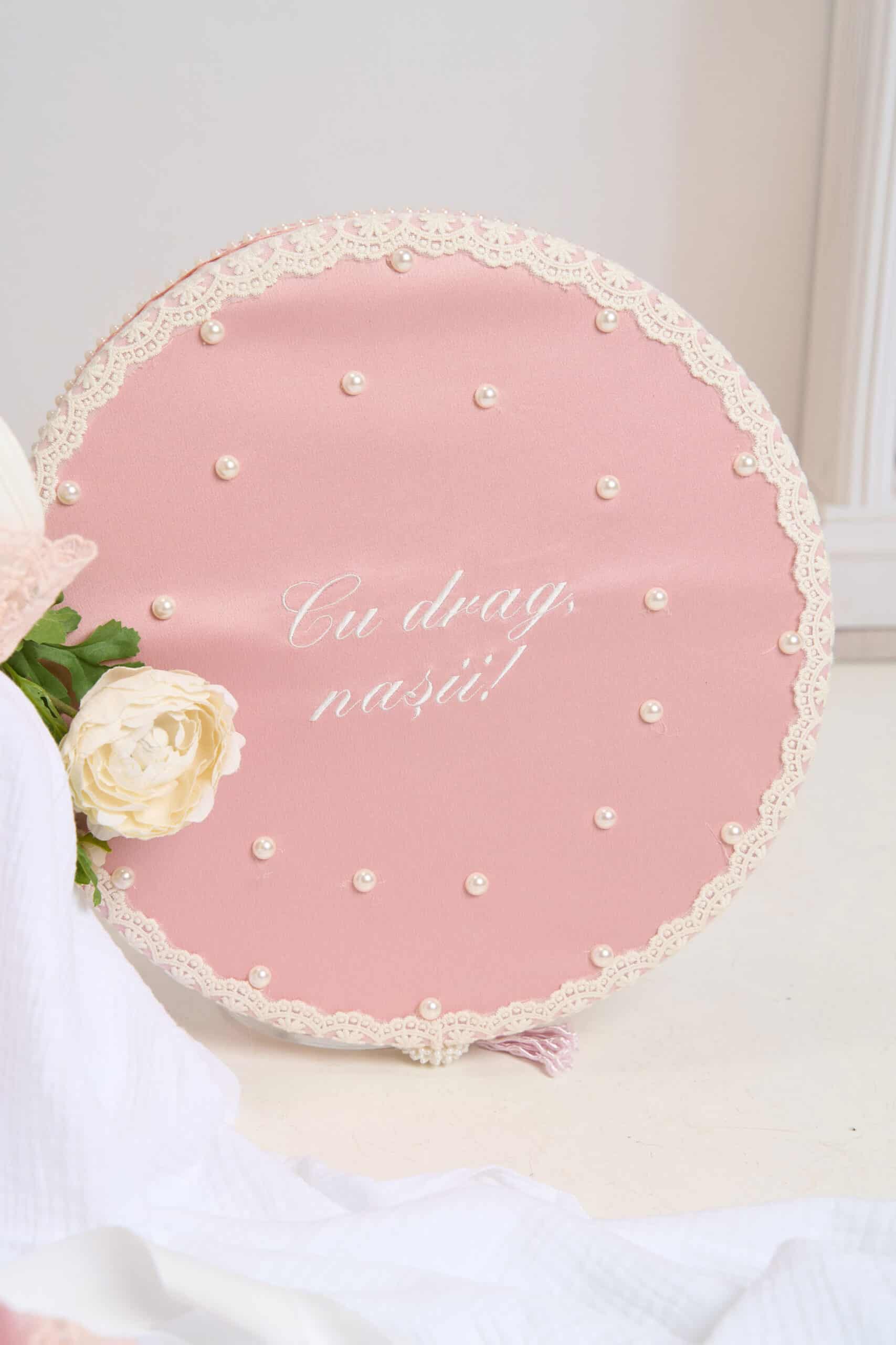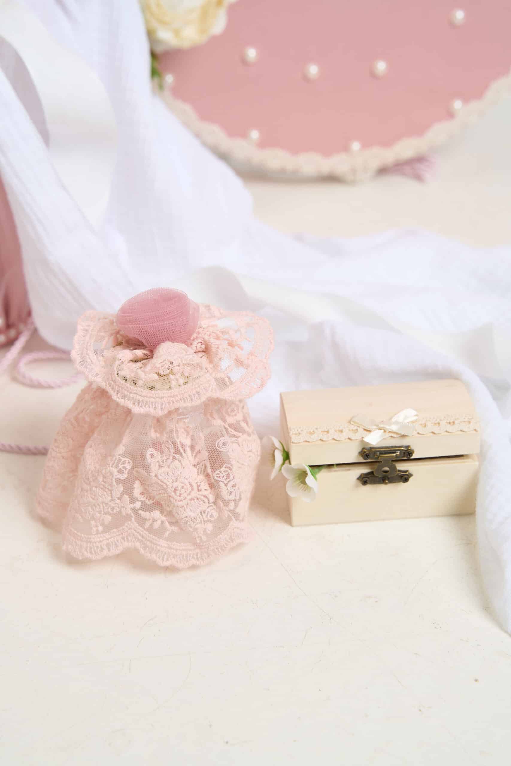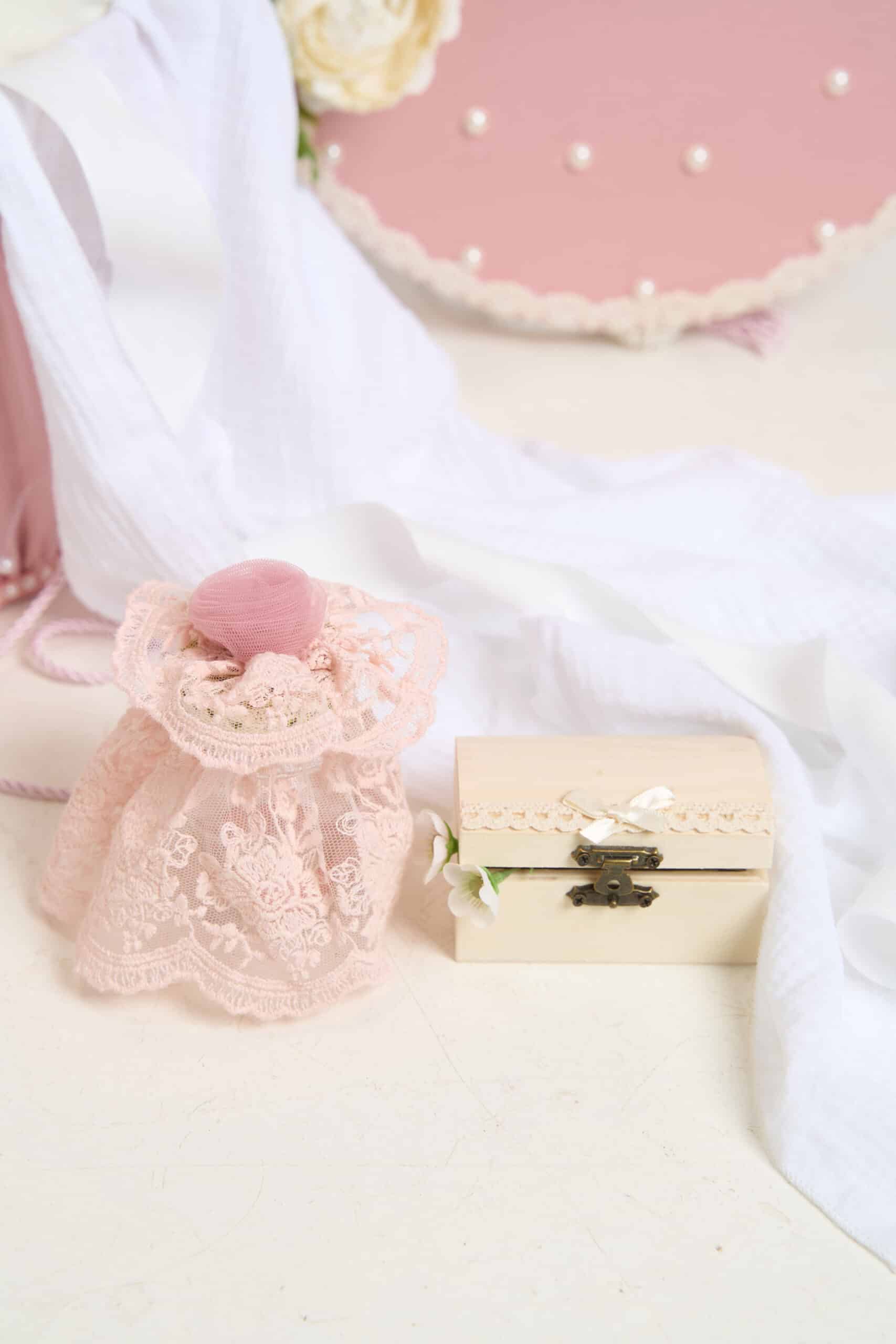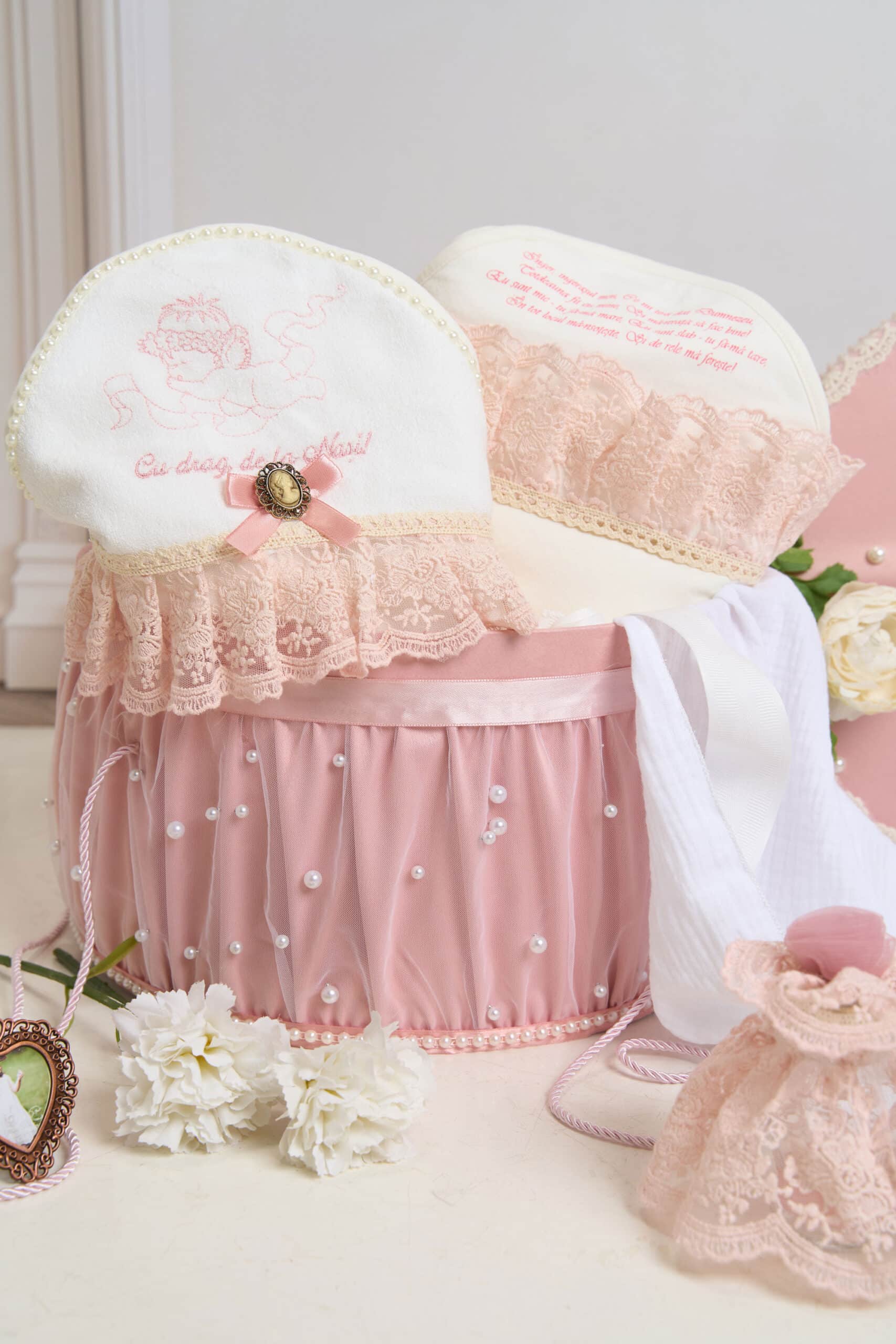 Cufăr elegant, vintage, decorat cu dantelă delicată și volane rafinate., ideală pentru: transportul hăinuțelor și accesoriilor de botez, prezentarea trusoului la biserică, păstrarea amintirilor de la botez.