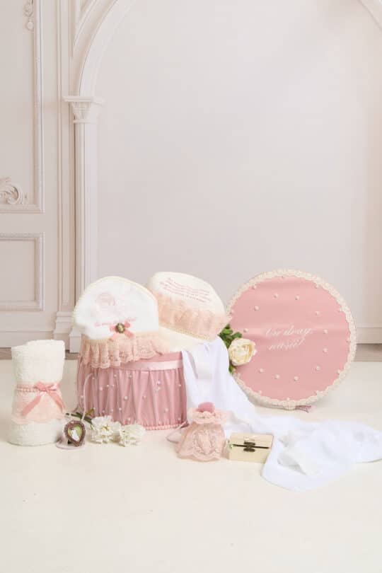 Pachet botez cu 15% REDUCERE – Cufăr Trusou Pearl – roz + Trusou botez – Claire