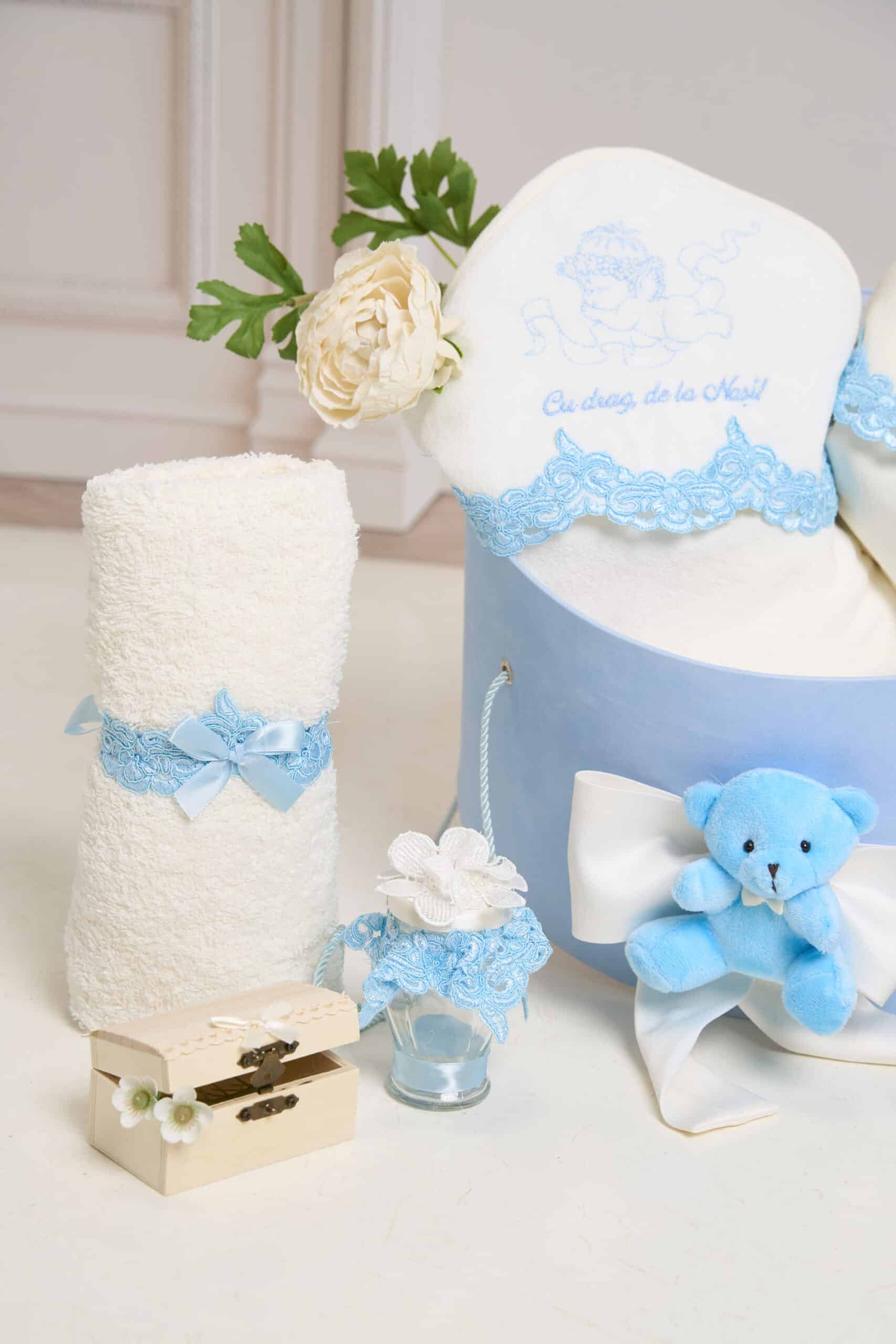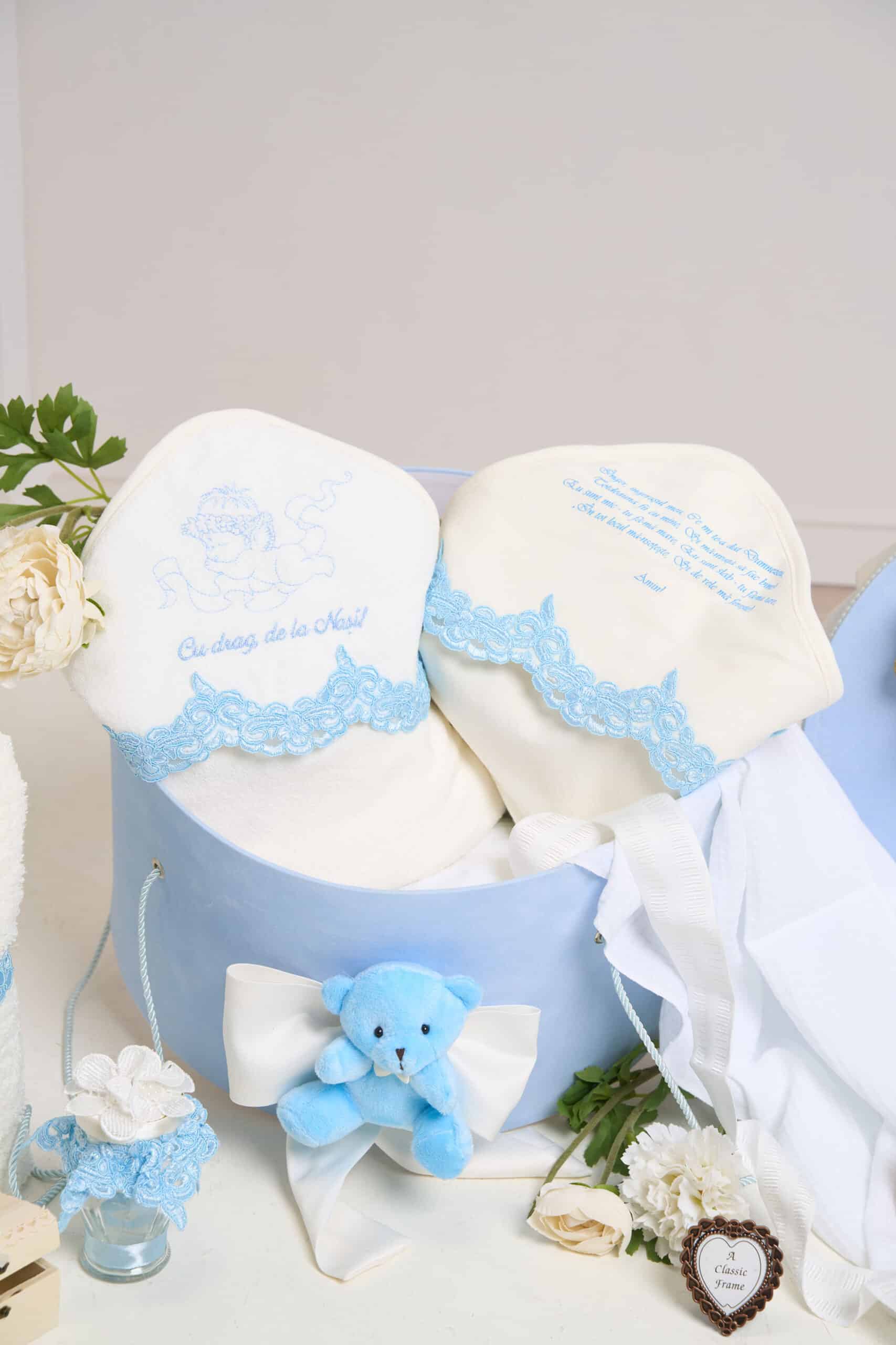 Pachet botez cu 15% REDUCERE – Cufăr – Ursuleț cu baloane – Bleu + Trusou botez – bleu