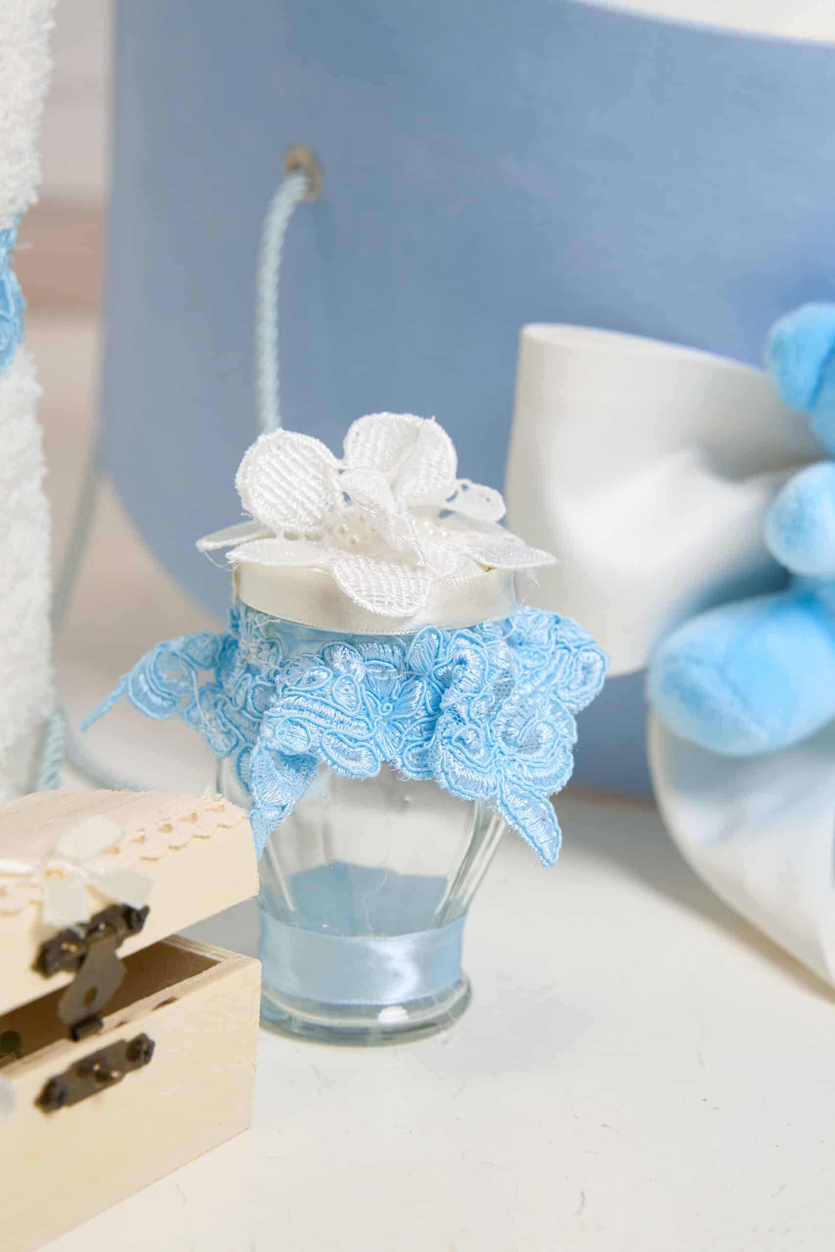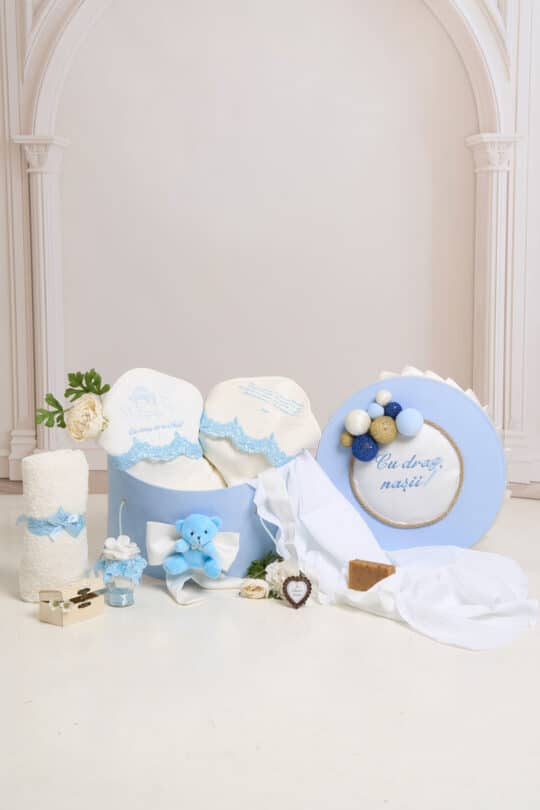 Pachet botez -15% REDUCERE – Cufăr – Ursuleț cu baloane – Bleu + Trusou botez – bleu