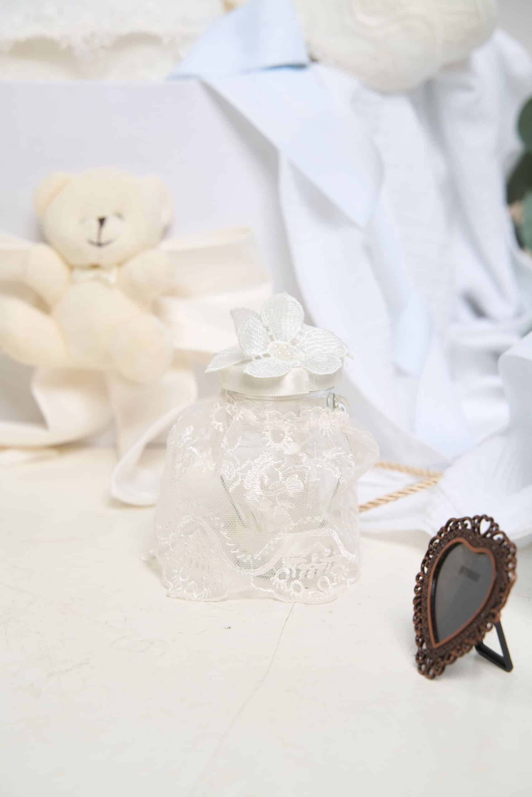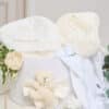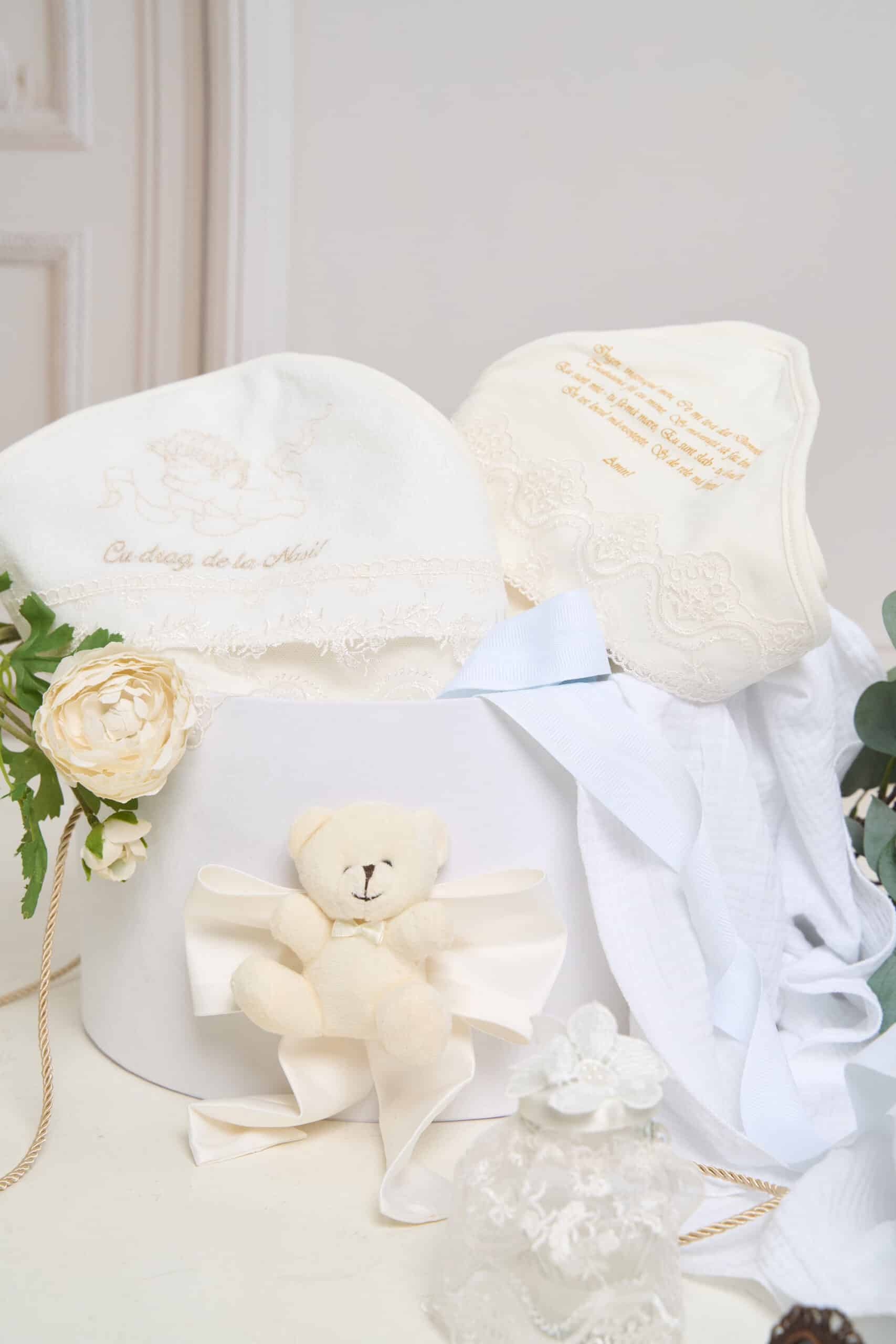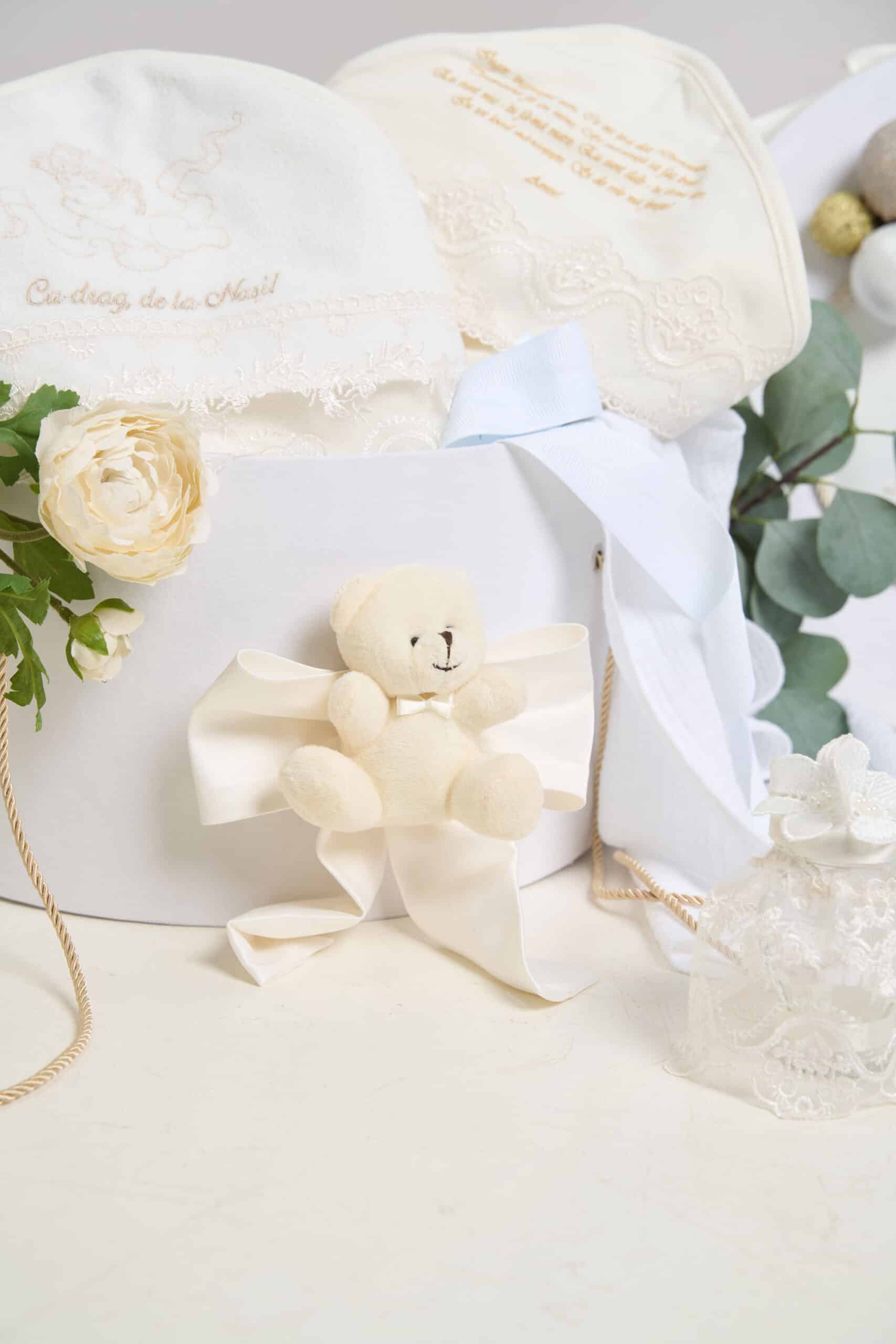 Pachet botez cu 15% REDUCERE – Cufăr – Ursuleț cu baloane – Ivoire + Trusou botez – ivoire