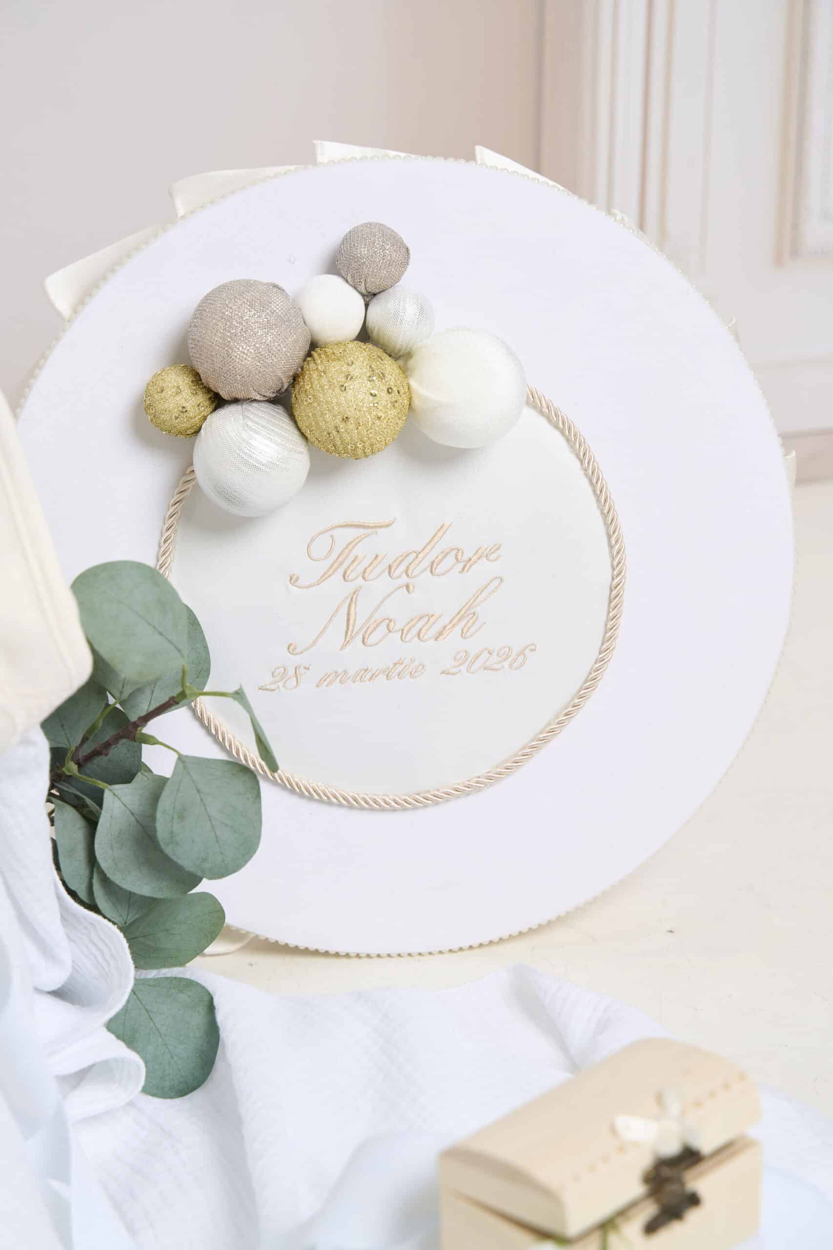 Cutie elegantă, decorată cu baloane jucăușe și fundiță, ideală pentru: transportul hăinuțelor și accesoriilor de botez, prezentarea trusoului la biserică, păstrarea amintirilor de la botez.