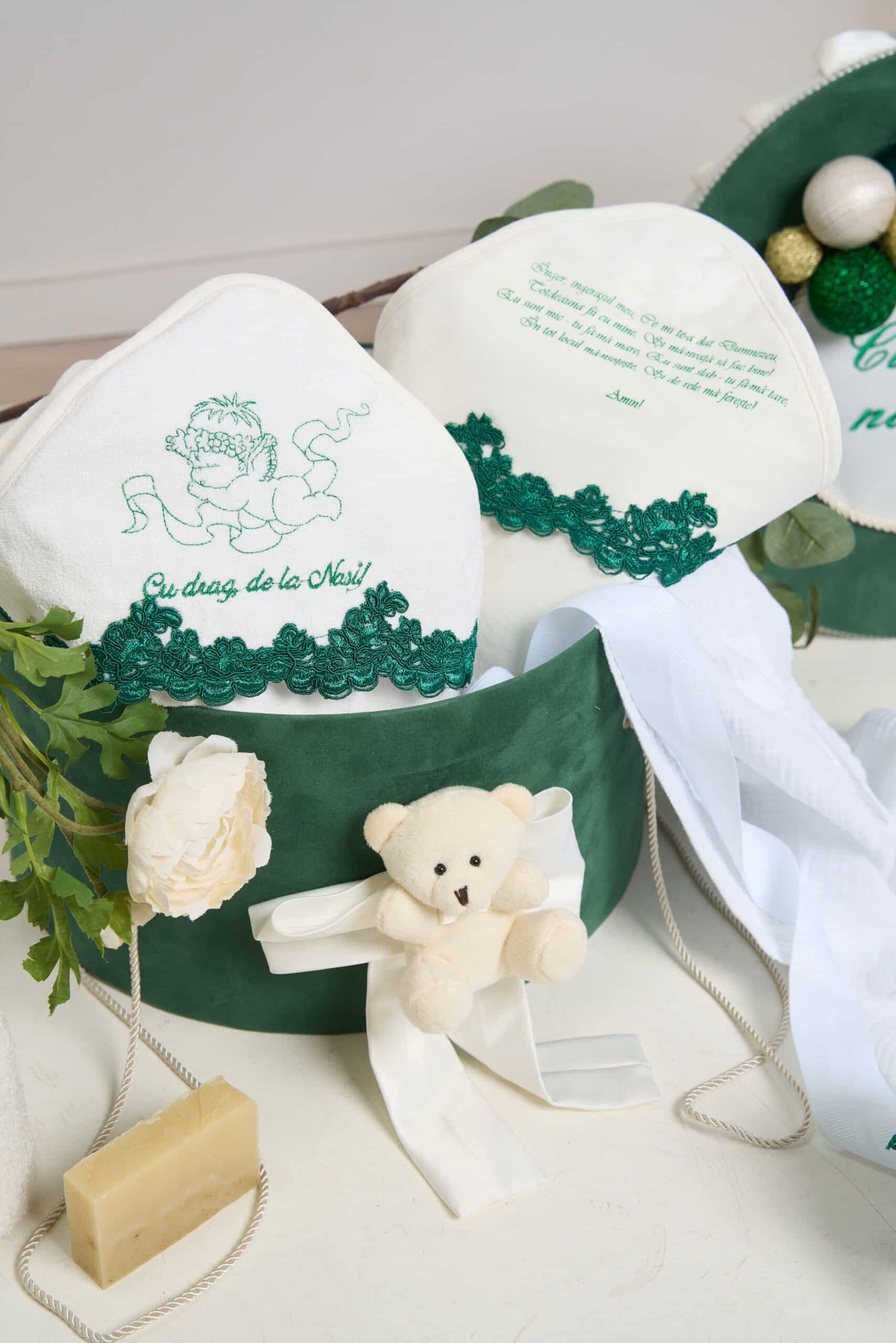 - Prosop cu capișon 82×82 cm – brodat cu îngeraș și mesajul „Cu drag, de la Nași!”