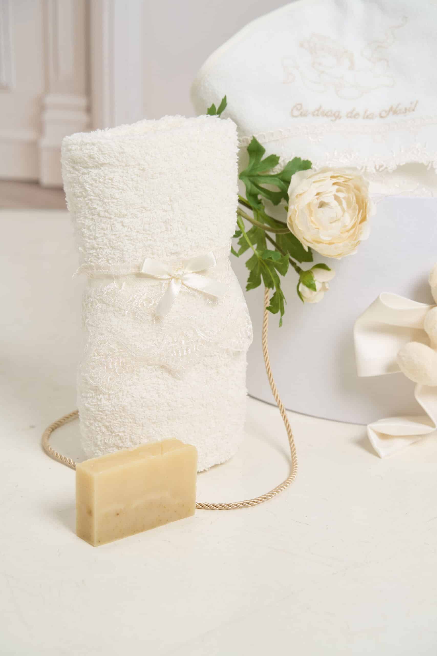 - Prosop cu capișon 82×82 cm – brodat cu îngeraș și mesajul „Cu drag, de la Nași!”