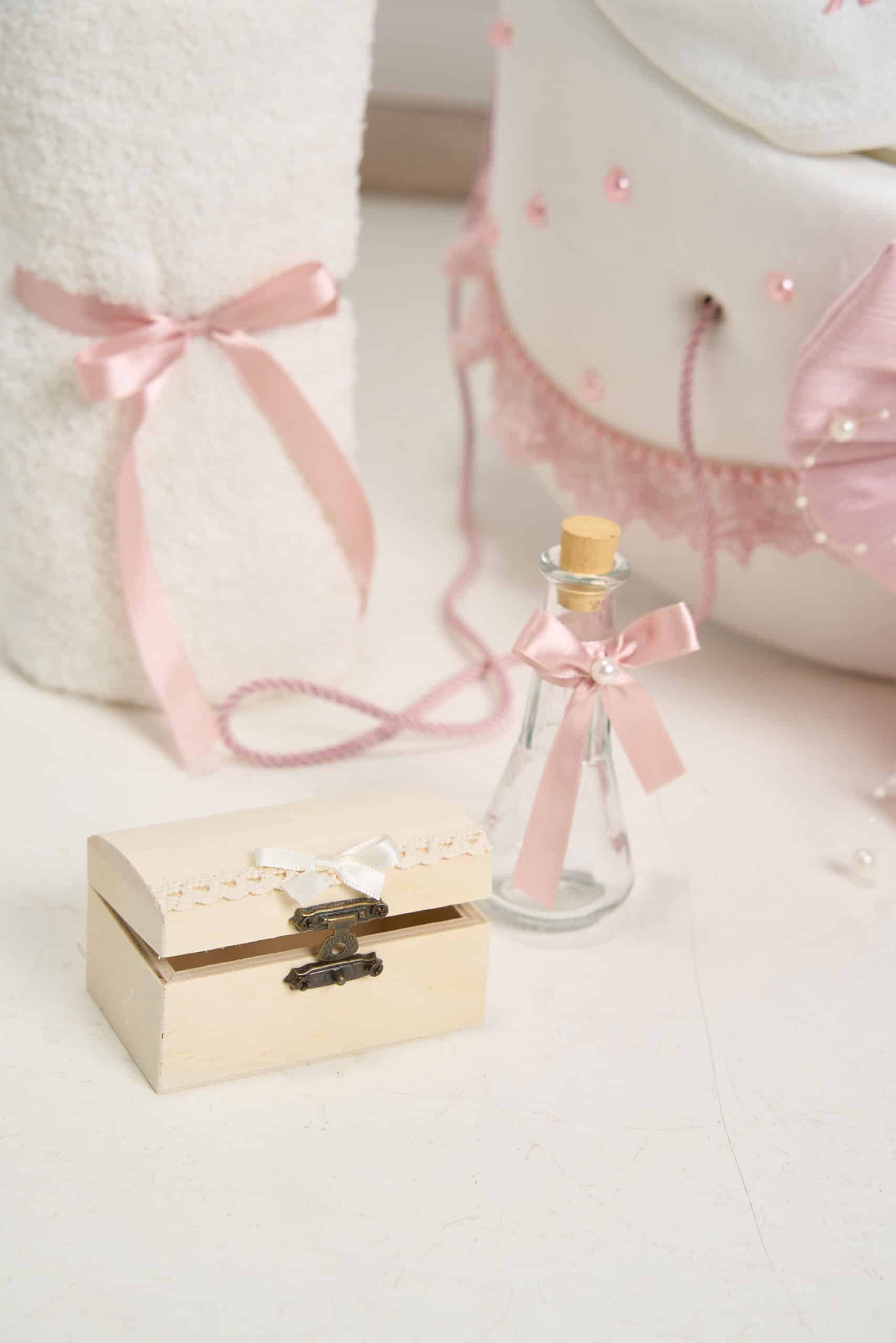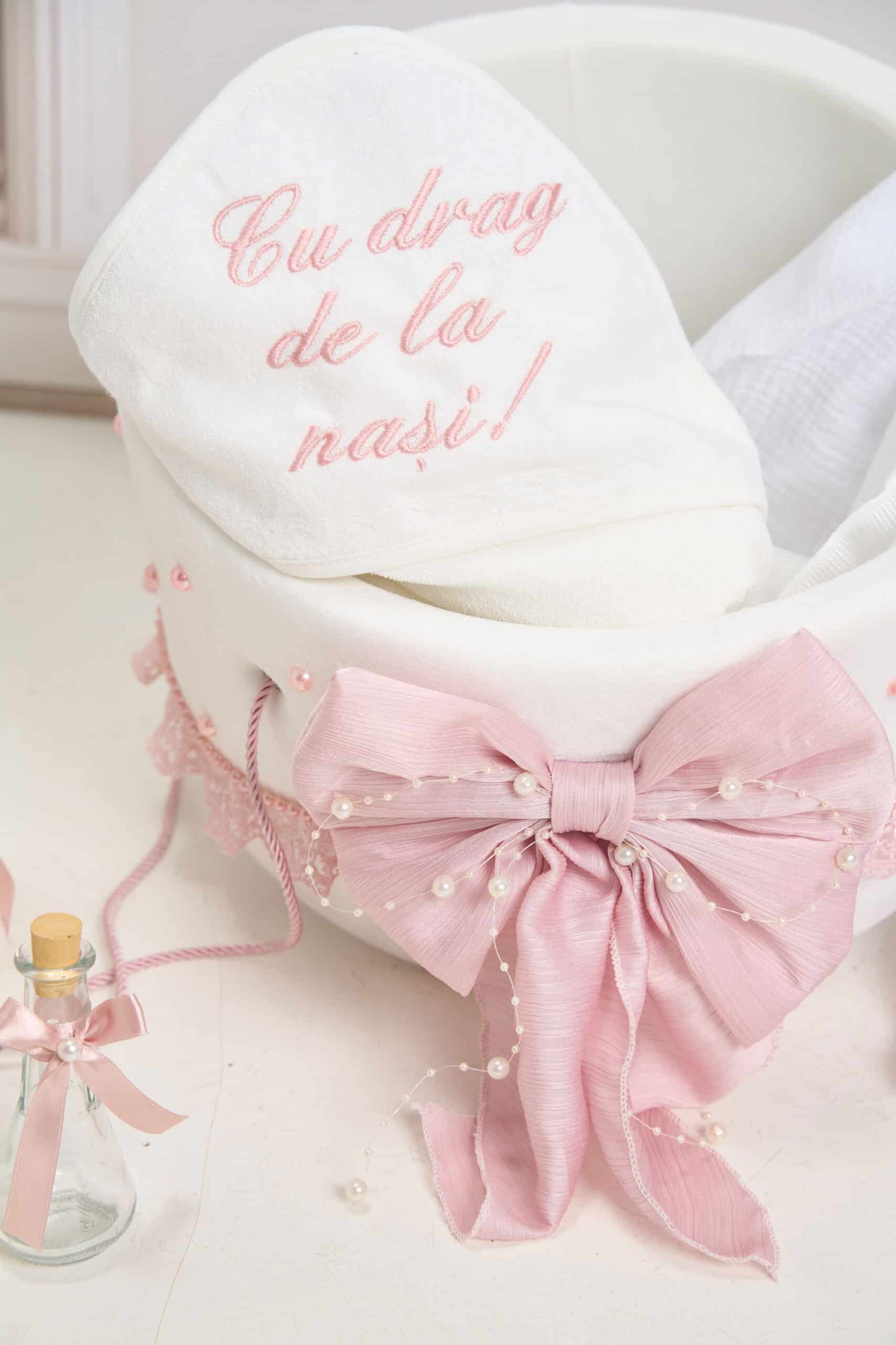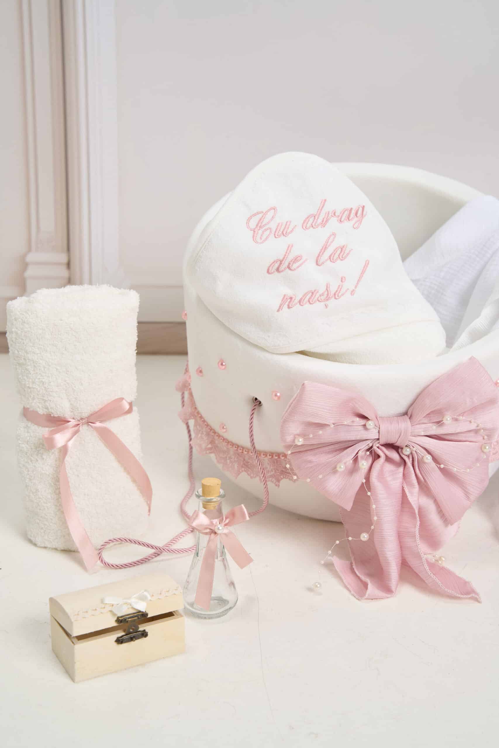 Pachet botez cu -20% REDUCERE – Cufăr buretat BORANGIC roz-vintage + Trusou PureBebe