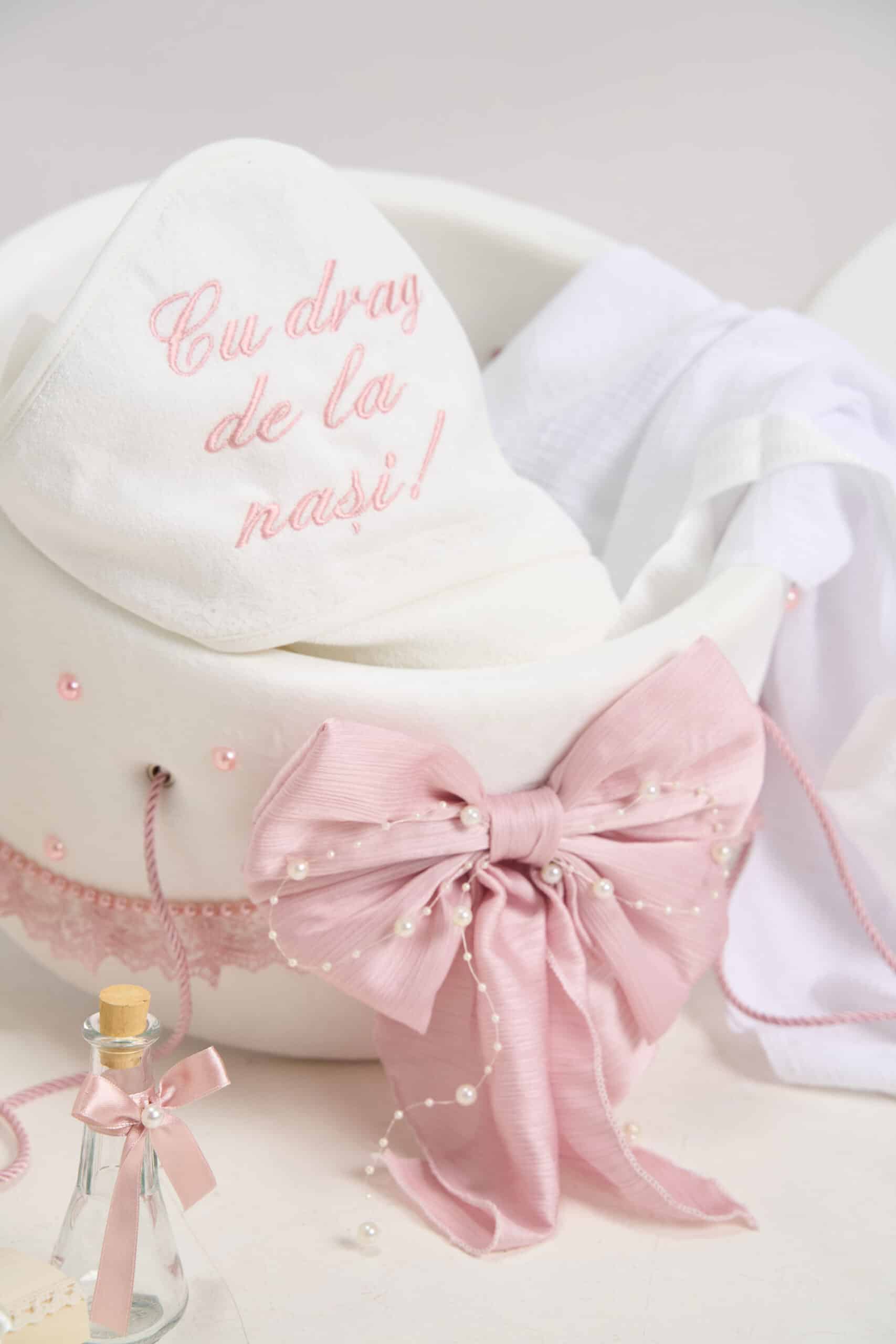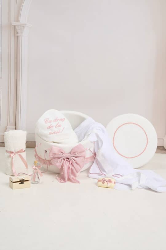 Pachet botez -20% REDUCERE – Cufăr Borangic buretat + Trusou PureBebe – roz