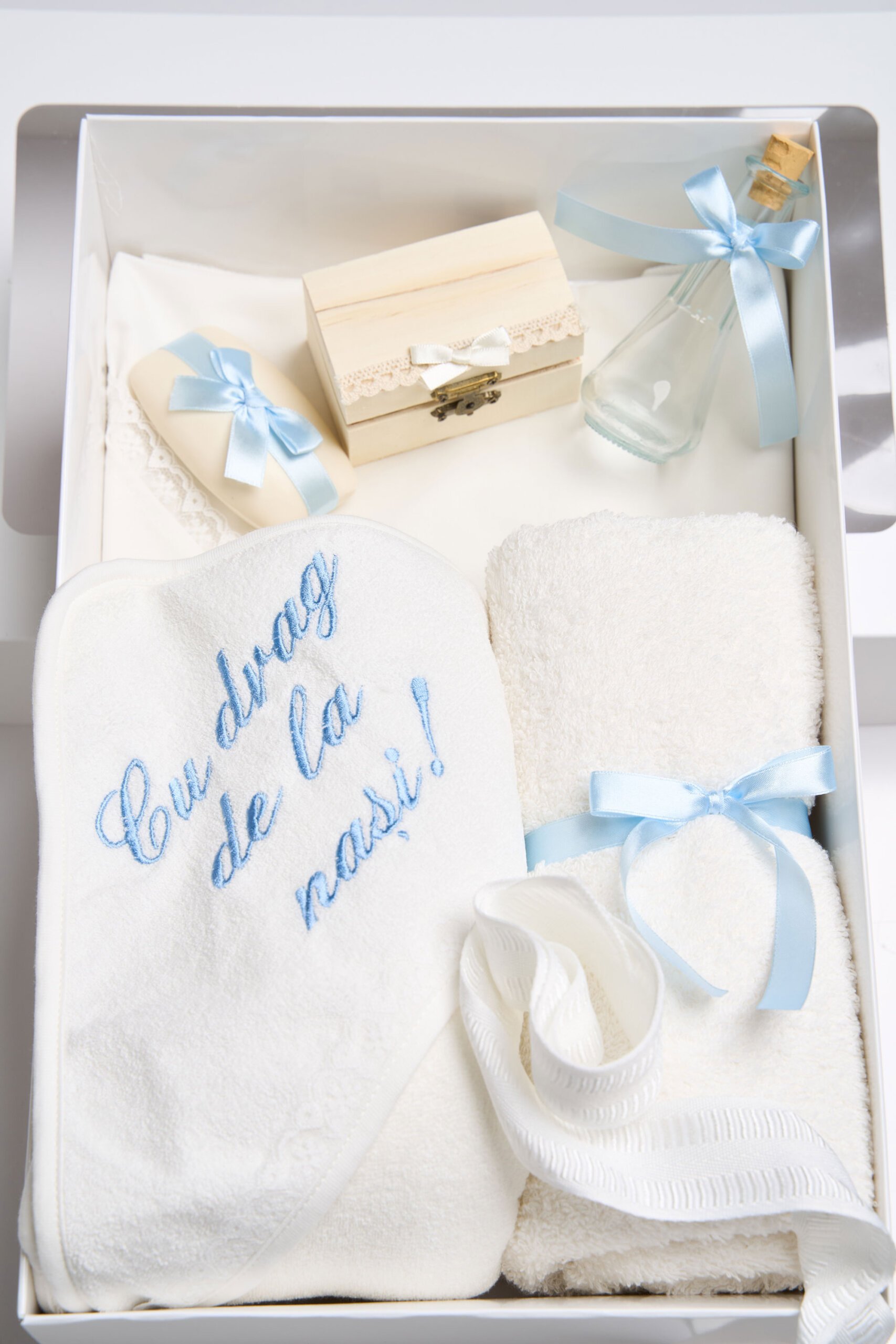 Pachet botez -20% REDUCERE – Cufăr buretat + Trusou PureBebe – bleu